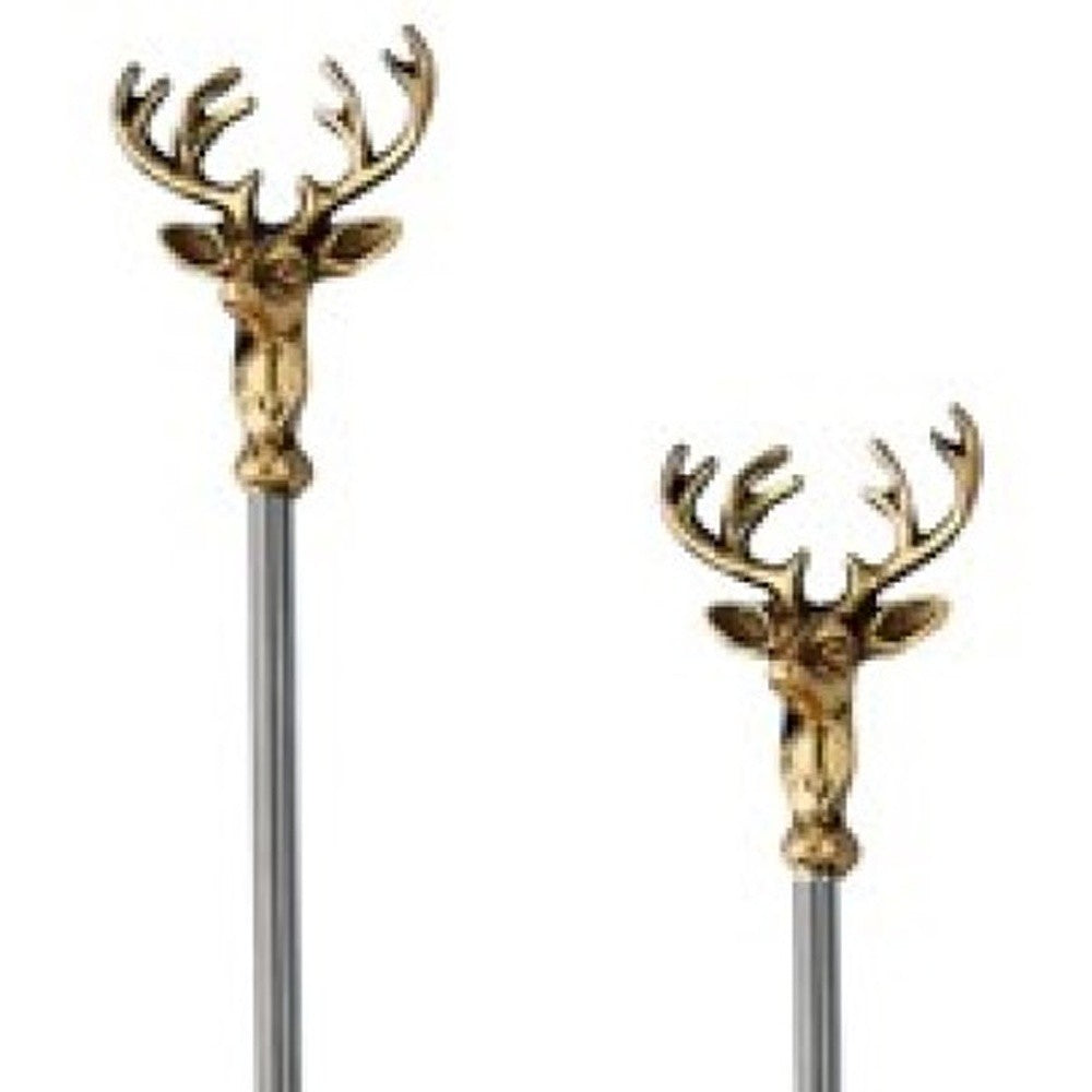 This Golden Stag Salad Serving Set is the perfect thing to have for your next dinner party. The base of servers are made from food-safe stainless steel and have a high silver shine to them, while the top is accented with 3D ornamental stag heads that are covered in a gilded gold finish. There is one serving spoon and one serving fork in the set. The details of the deer and the golden color gives a very elegant yet rustic final look to this serving spoon set. These servers can be used to serve food or they be used as decor in your kitchen or dining area. They can even be framed and hung up in your kitchen. 2" H x 14" W x 15" D