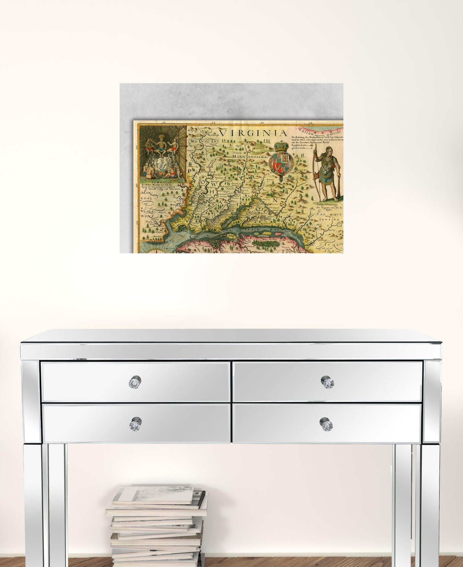 Bring in a sense of whimsical vintage design to any space in your home with this Map of Virginia c1627 Vintage Poster. This poster is generously sized and is painted on a heavyweight matte art paper. There are a few sketches that surround the detailed map of the state of Virginia. This poster will add vintage charm to any room of your home. It can be used as a poster, as a framed piece, or as mounted wall art to fit any aesthetic.