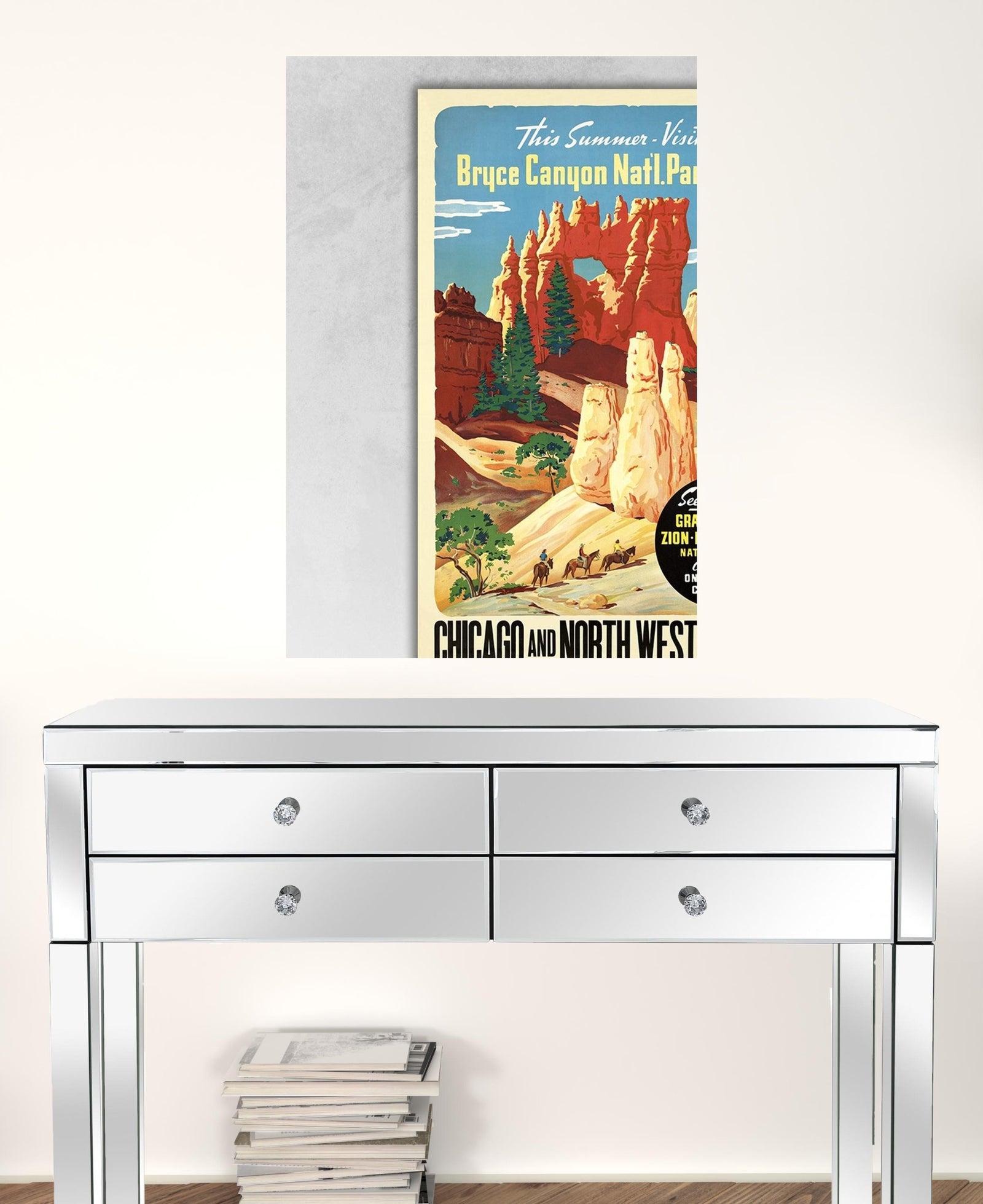 This great Vintage 1950s Bryce Canyon National Park Utah Travel Poster shows a small group on a horseback excursion among the canyons, arches and hoodoos of Bryce Canyon. The caption reads: "This Summer Visit - Bryce Canyon Nat'l. Park, Utah See All Three - Grand Canyon - Zion - Bryce Canyon National Parks Combined in One Low-Cost Circle Trip - Chicago and North Western Line". Printed on heavyweight matte art paper, this vintage looking travel poster is ready to frame, mount, or display as a poster directly on the wall.
