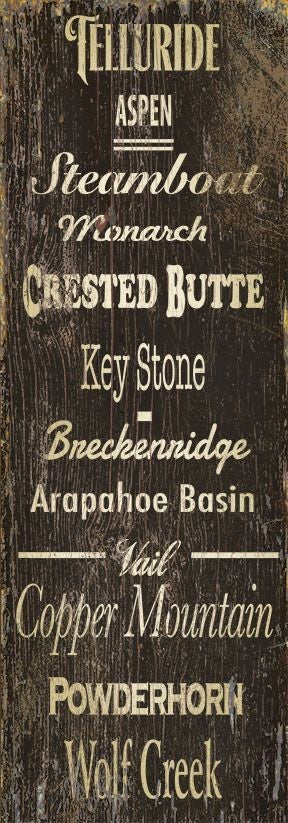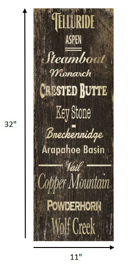 Vintage and distressed, the Popular Ski Resorts Wall Decor is printed on distressed wood panels which enhance the vintage look of the wall art. This piece comes in two different sizes and makes a unique addition to any ski house, living space, or bedroom. 32" x 11" x 1".