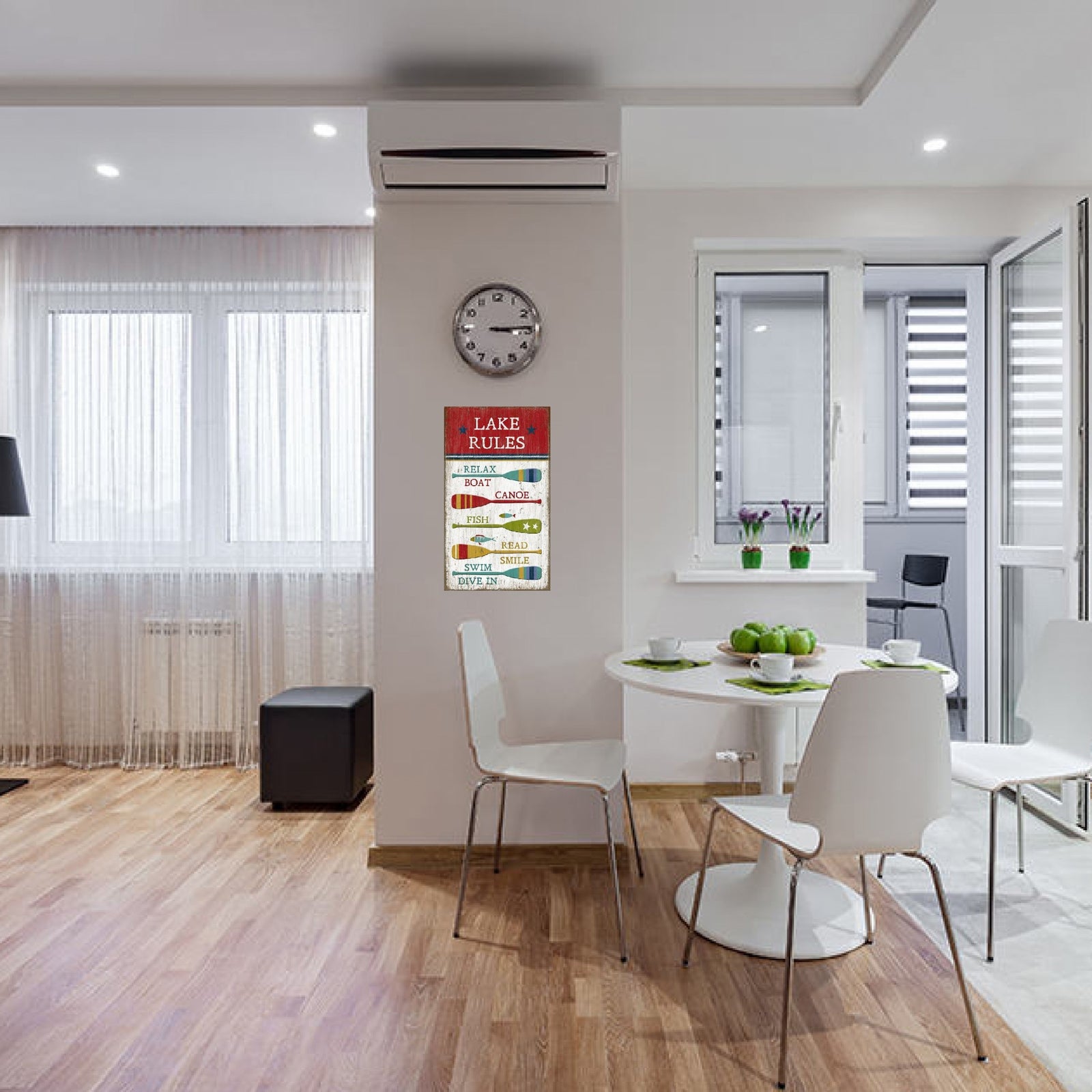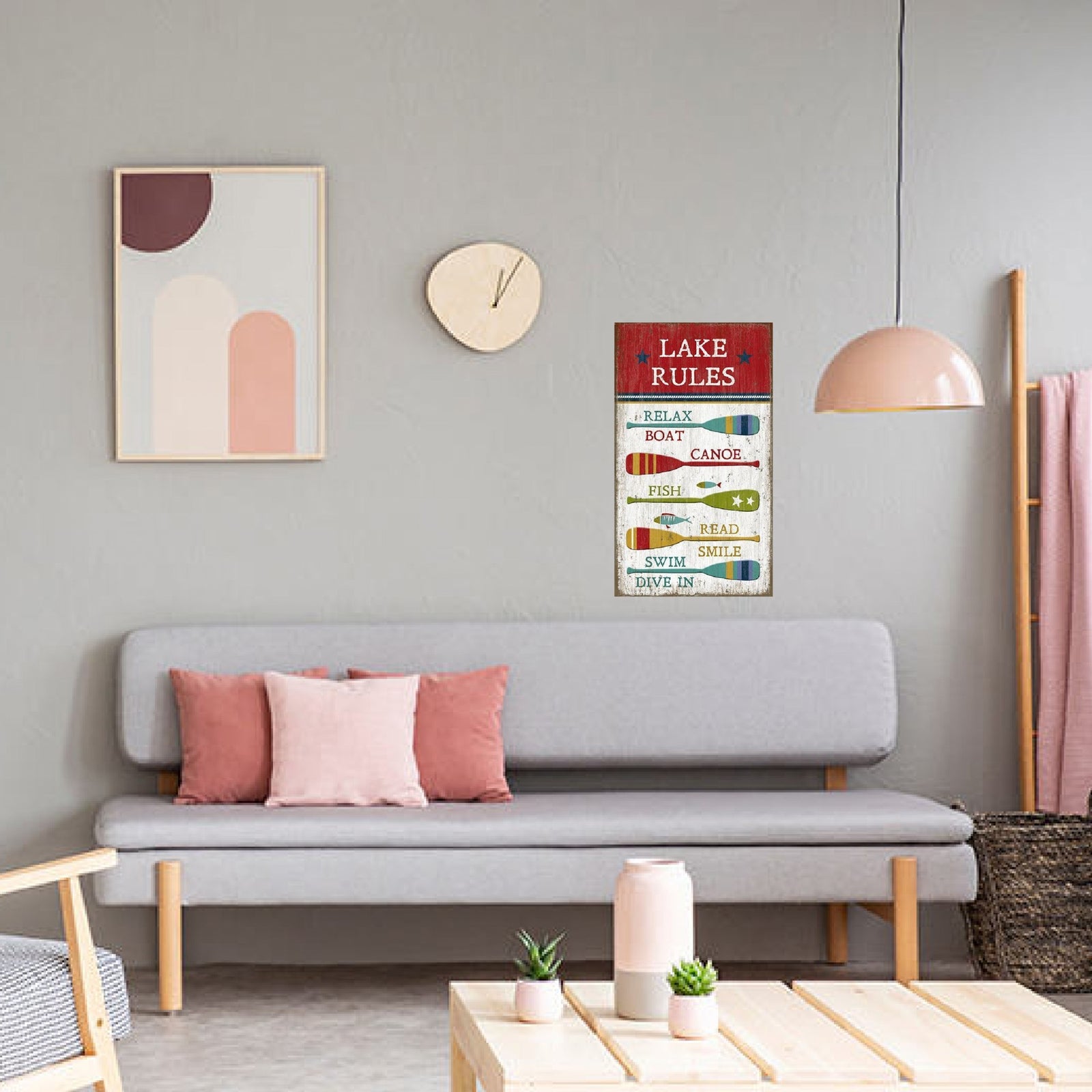 Vintage and distressed, the Vintage Boat Oars Lake Rules Wall Art embodies fun and important sentiments for your time at the lake. We all need a reminder to Relax and Smile and have fun sometimes. The vintage look of the faded primary colors on this casual, rectangular piece of art are printed on genuine wood with knots and grains that give it a realistic vintage look and feel. This fun piece is perfect for any lake house. 15" x 26" x 2".