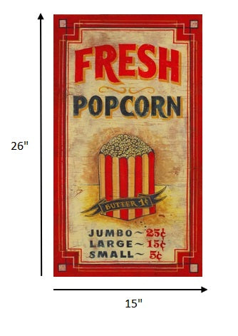 Vintage and distressed, the Fresh Popcorn Advertisement Wall Decor brings back memories from long ago. The print goes over distressed wood panels that include knots and other imperfections which enhance the vintage look of the wall art. This piece is perfect for a movie room, bedroom, or living room. 15" x 26" x 2".