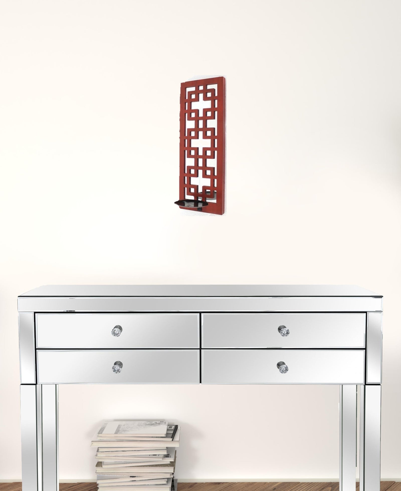 brighten the spark and glow of your home decor with this vintage candle holder sconce complement with a lattice mirror. our sconce features a classical chinese red lattice pattern, designed to reflect an ancient orient charm in every home. we back this candle holder sconce to transform your decor with coziness, warmth and unique chinese beauty. it comes with a solid wooden structure that dazzles with soft candlelight all the way. - vintage collection - red finish - lattice mirrored back - metal candle holder