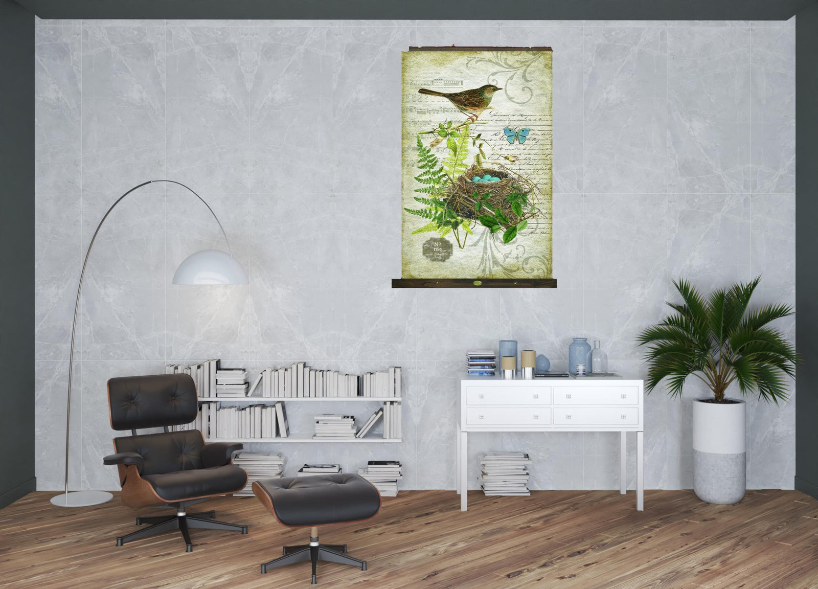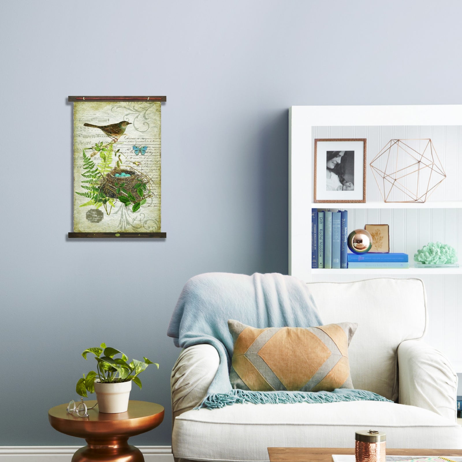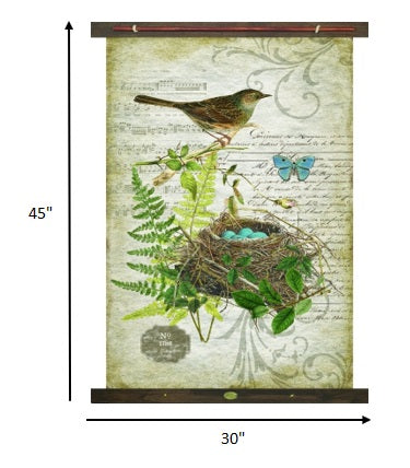 Vintage and decorative, this Vintage Song Bird XL Wall Décor has an elegant look. This charming wall art hangs from a decorative white rope hanger and is complete with wooden bars on the top and on the bottom. This beautiful bird print resembles a vintage french post card design and is printed on a canvas tapestry material. 45" x 30" x 1".