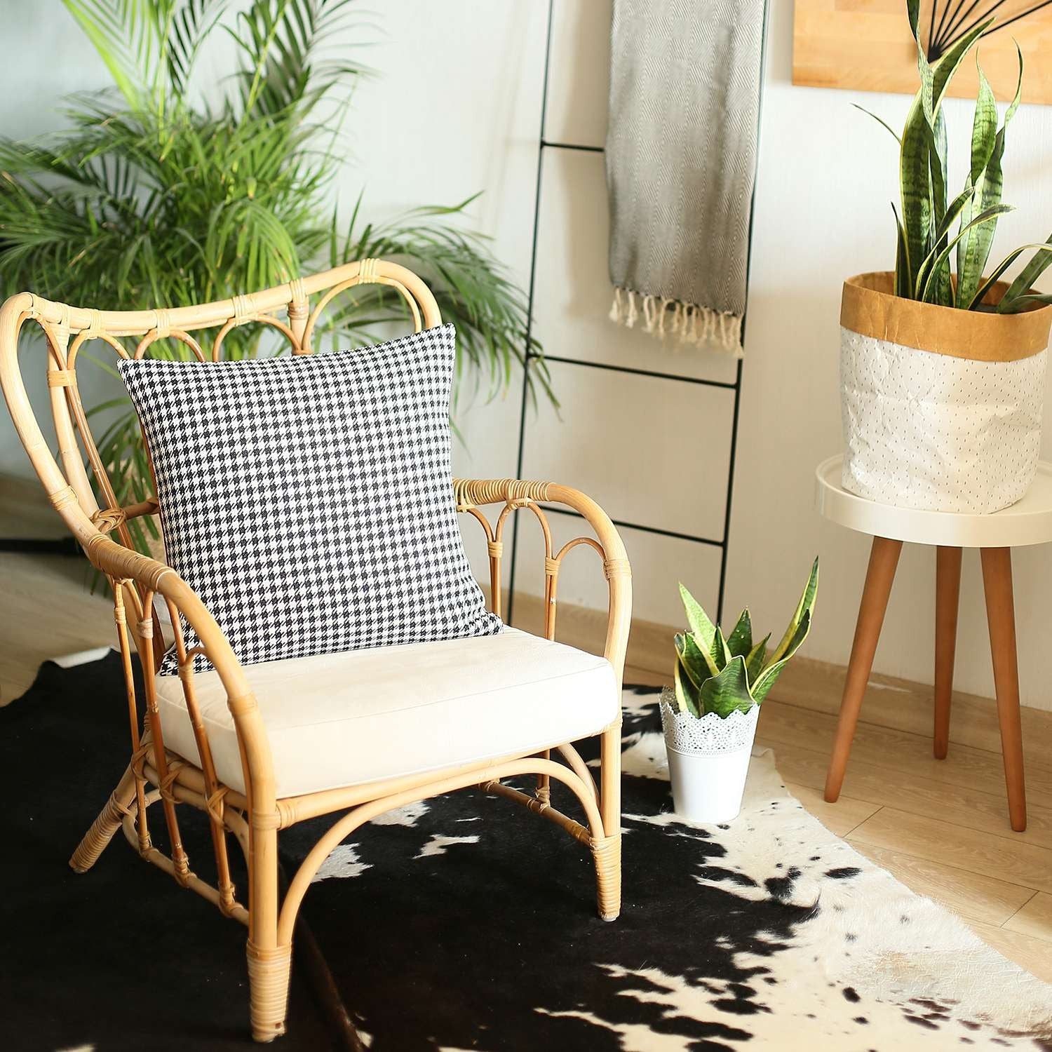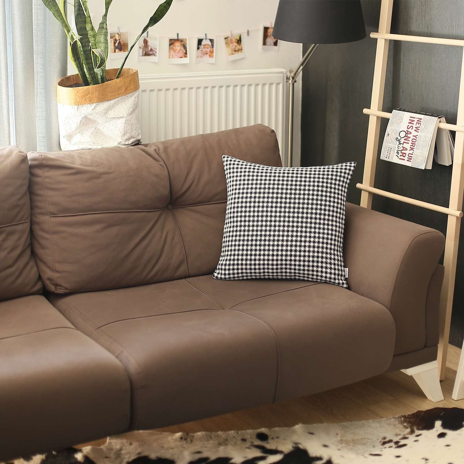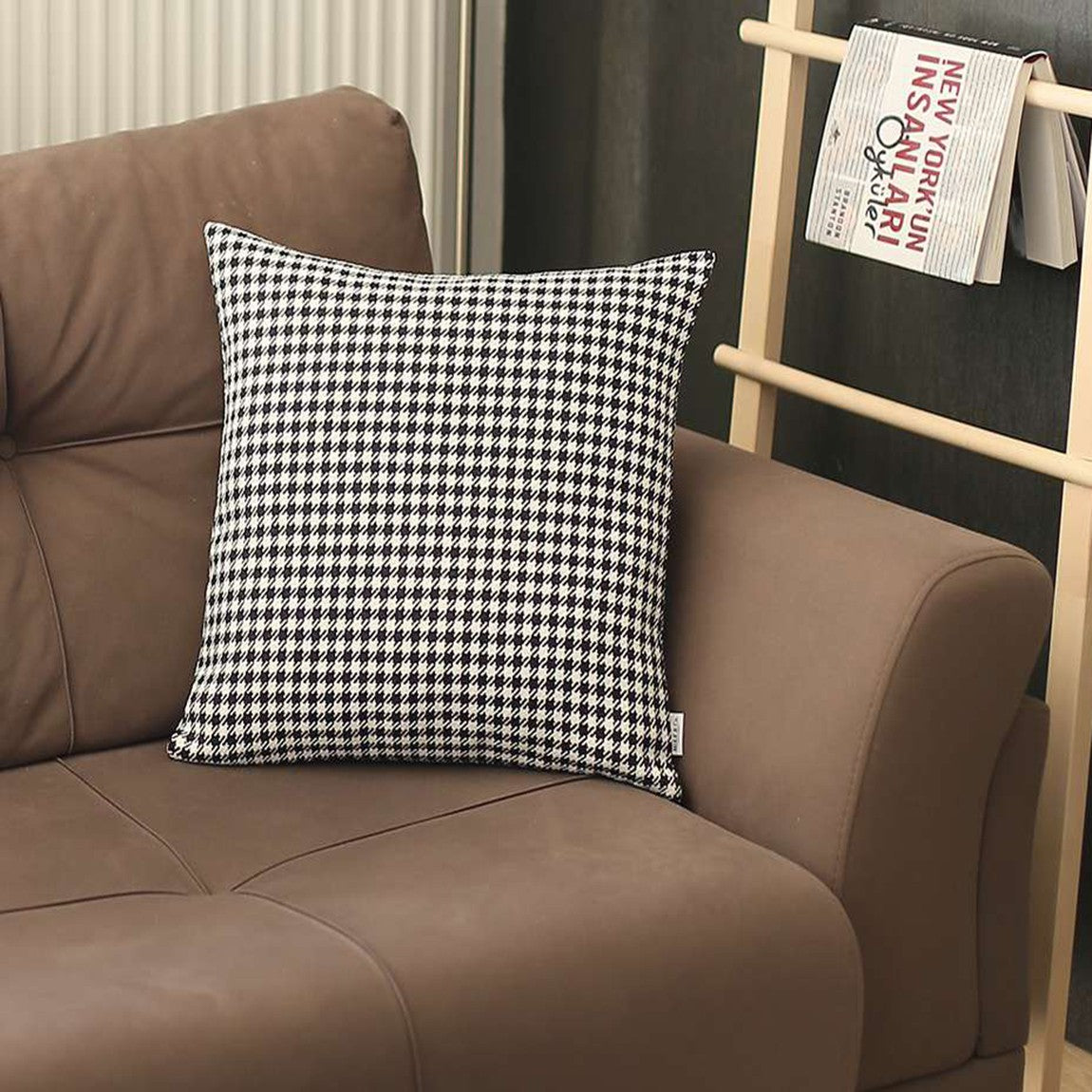 Decorate your living space with this Black Houndstooth Pattern Throw Pillow that adheres to a classic pattern with a subtle color palette. Beautifully designed with black houndstooth patterns in jacquard weaving over a white base for a simple yet sophisticated look amidst any surrounding. Handmade in Turkey with 100% premium polyester fabric to ensure durability and color intensity while the OEKO-TEX Standard 100 certification speaks of its top-notch product quality and safety. The edges feel smooth and refined due to its hidden zipper closure while the soft poly filling contributes to its fluffy look and comfort. Aligning with the aesthetics of contemporary styling, this decorative throw pillow will add an understated elegance to your modern home. 18” x 18” x 1”