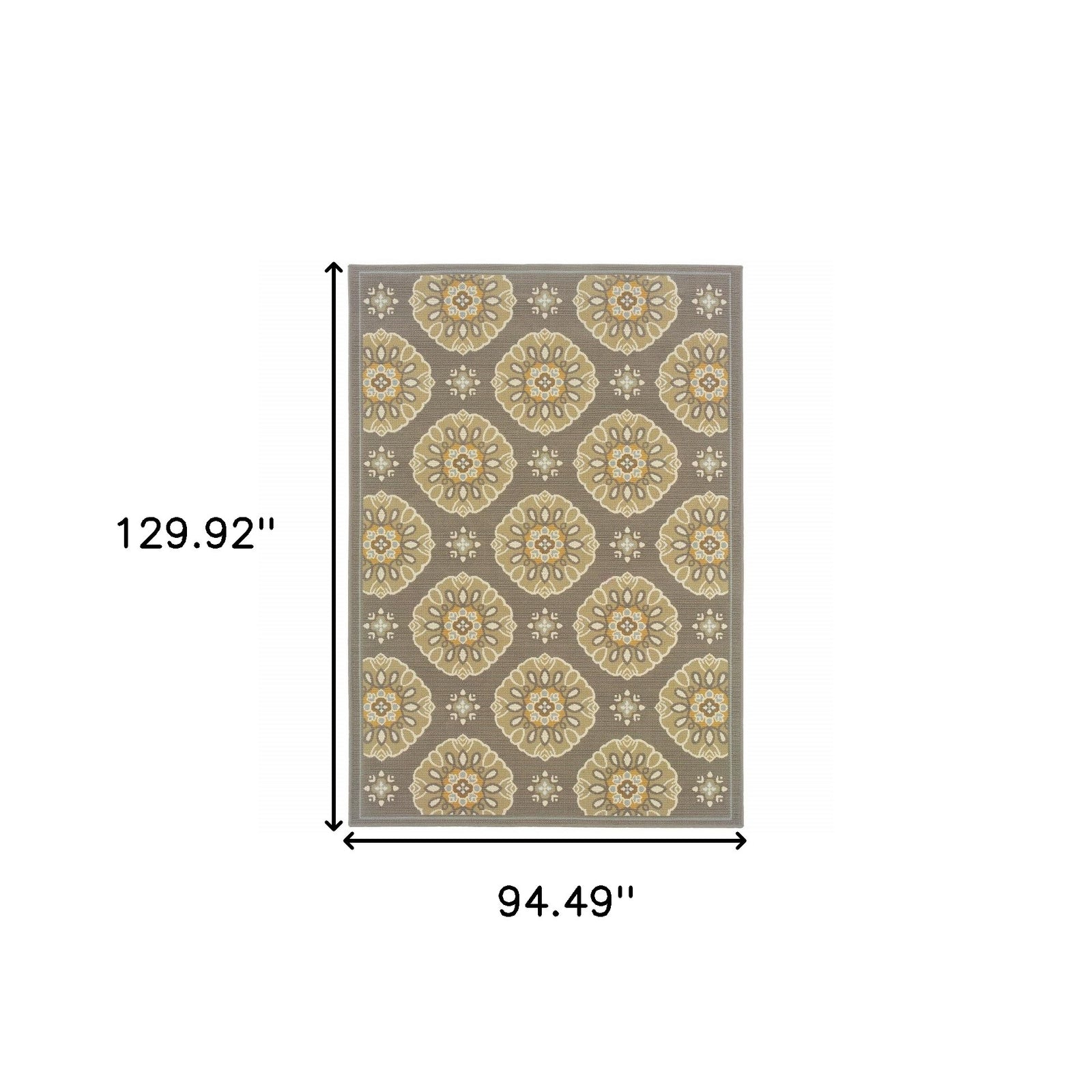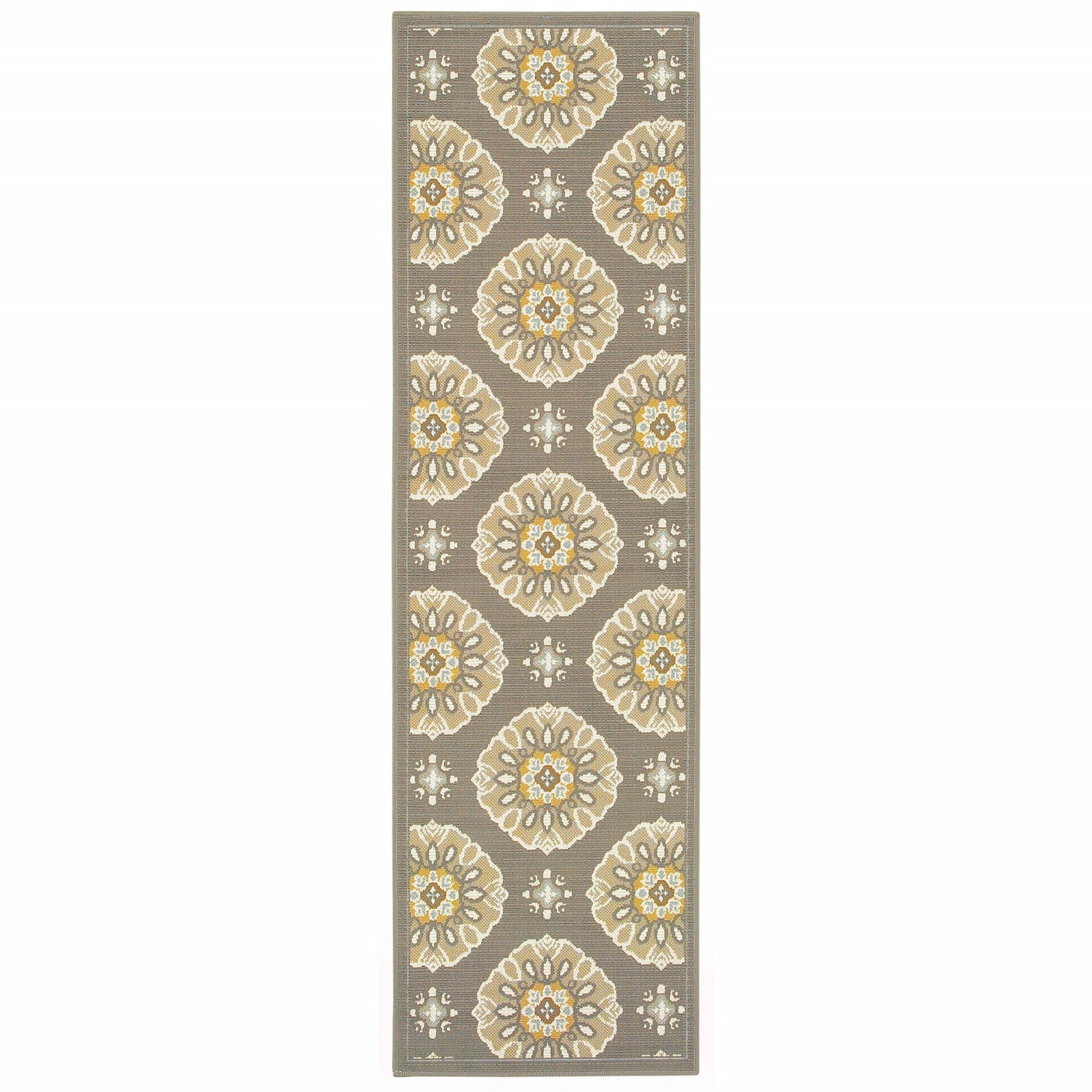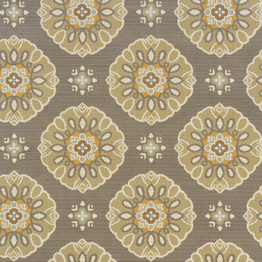 This beautiful Grey Gold Floral Medallion Discs rug will grace your home with neutral toned gray base with brown, beige, gray and pops of gold. It is made of a machine-woven quality of easy-care polypropylene with textural loop construction that adds much surface interest. The colors are on trend with many new fabrics in today’s market; from outdoor furniture to indoor throw pillows, they will add a touch of color and casual sophistication to any space.