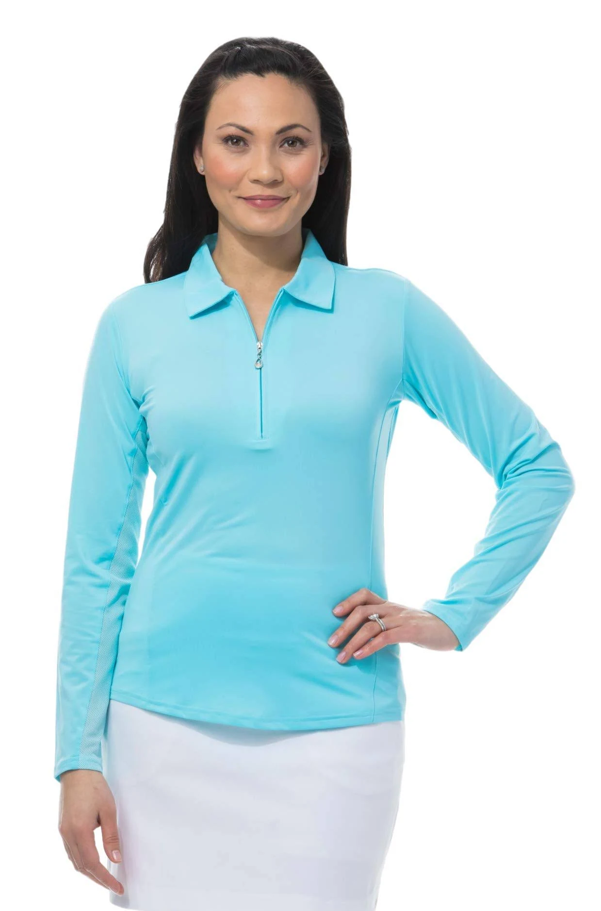 Zipper closure UV 50 Protection: SolCool offers permanent UPF 50 sun protection that never washes out. Most other polo shirts only offer UPF 10 and use a topical "plastic spray" to produce their sun protection - this washes out after a few washes Permanent Cooling: SolCool wicking and quick dry fabric with mesh inserts in the sleeves create a billowing effect while wearing, keeping you extra cool and comfortable while protecting you from the sun Easy Care: SolCool is ultra-light with a with a luxurious feel and can be washed and dried in regular cycle Polo Collar UV Sun Protection: SolCool is the prefect everyday style and can be worn on and off the golf course Great for: Golf, Tennis, Equestrian, Sailing, Walking, Hiking, Boating, Fly Fishing! SanSoleil "SolCool Fabric" Performance print polo offers moisture wicking, quick dry and athletic stretch nylon inserts for cooling ventilation. The vented arms offer extra airflow around the body. UPF 50 protection is a given in all SanSoleil designs. This style is great for sports that require fabrics that move and are lightweight for exertion in the sun's heat.