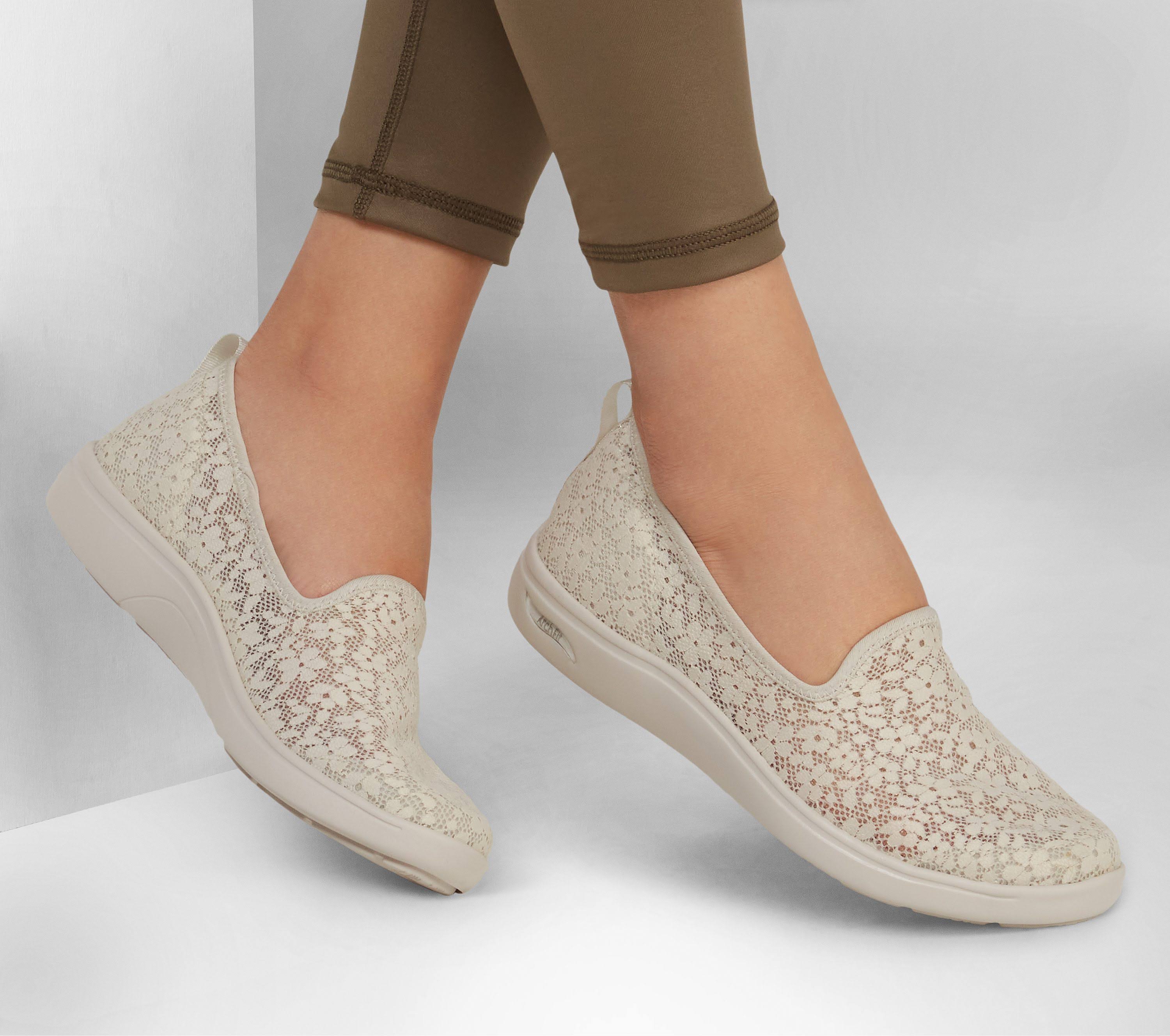 Romantic florals and easy-wearing comfort meet in the Skechers Arch Fit Uplift - Romantic shoe. This casual skimmer flat features a breathable floral mesh upper with removable Arch Fit insole and a lightweight ULTRA GO cushioned midsole.