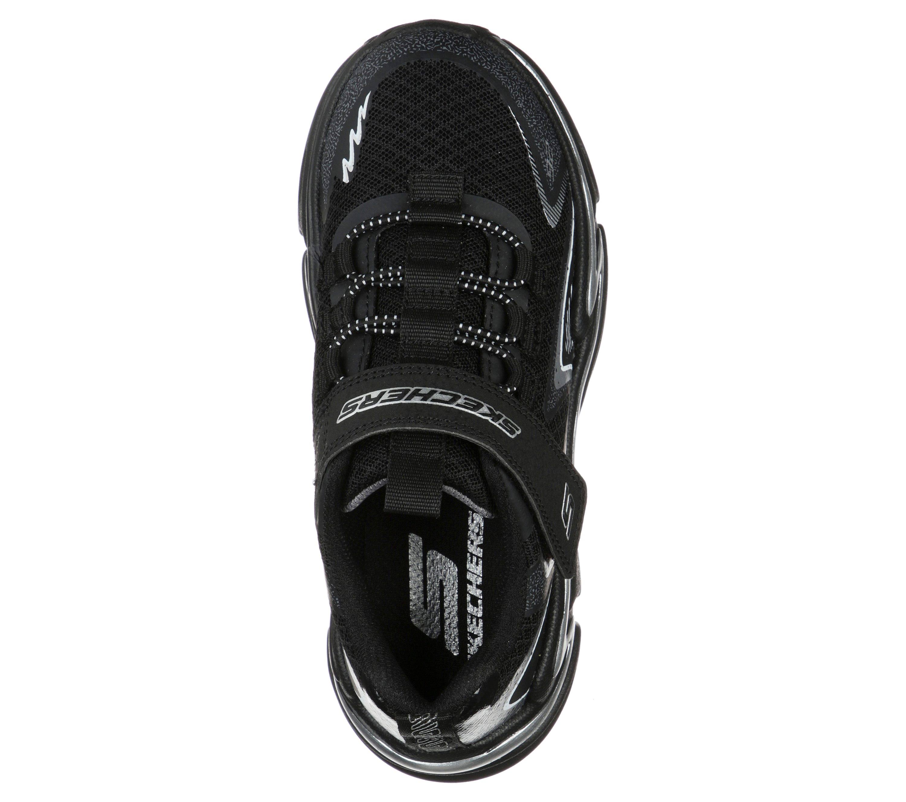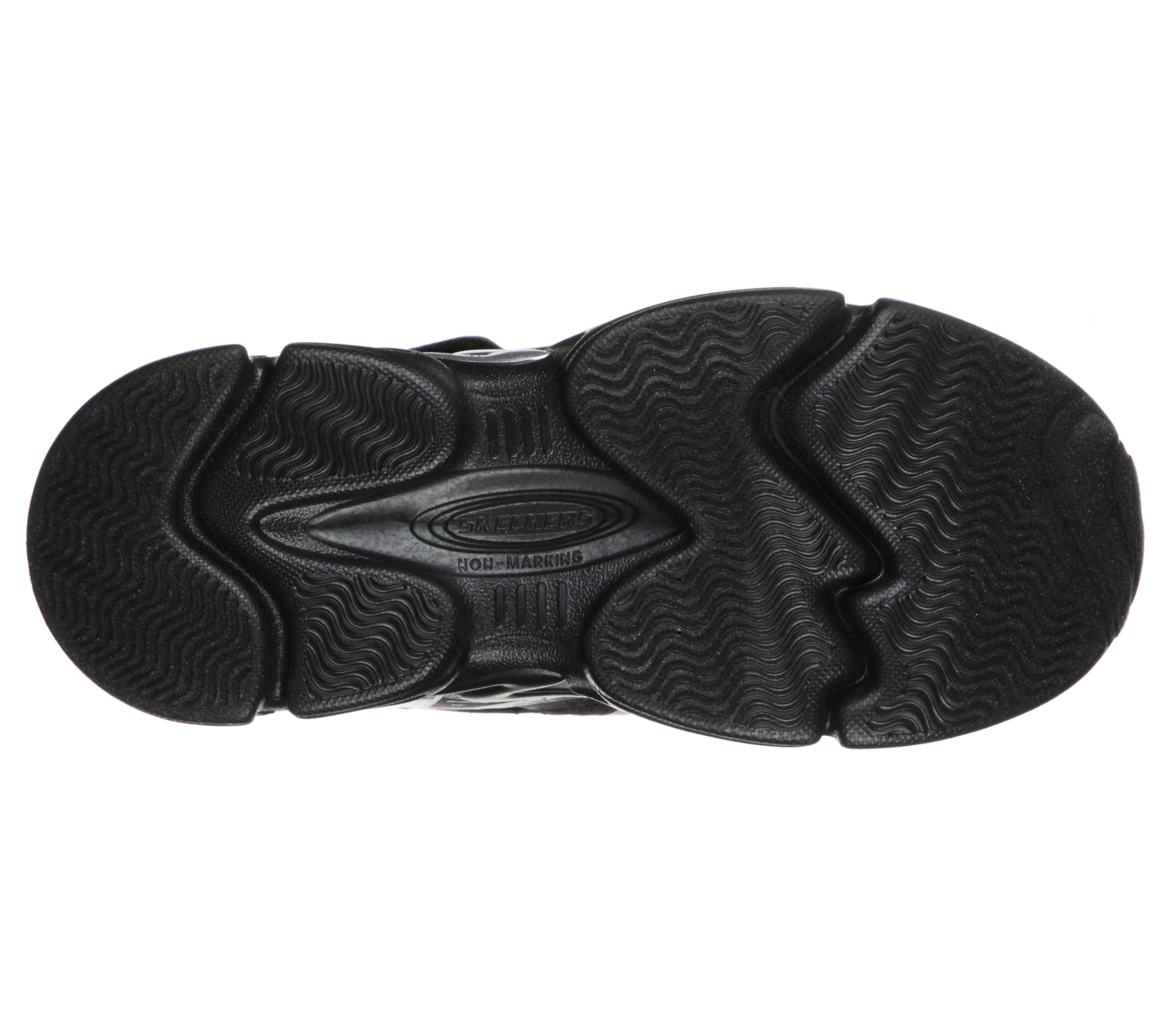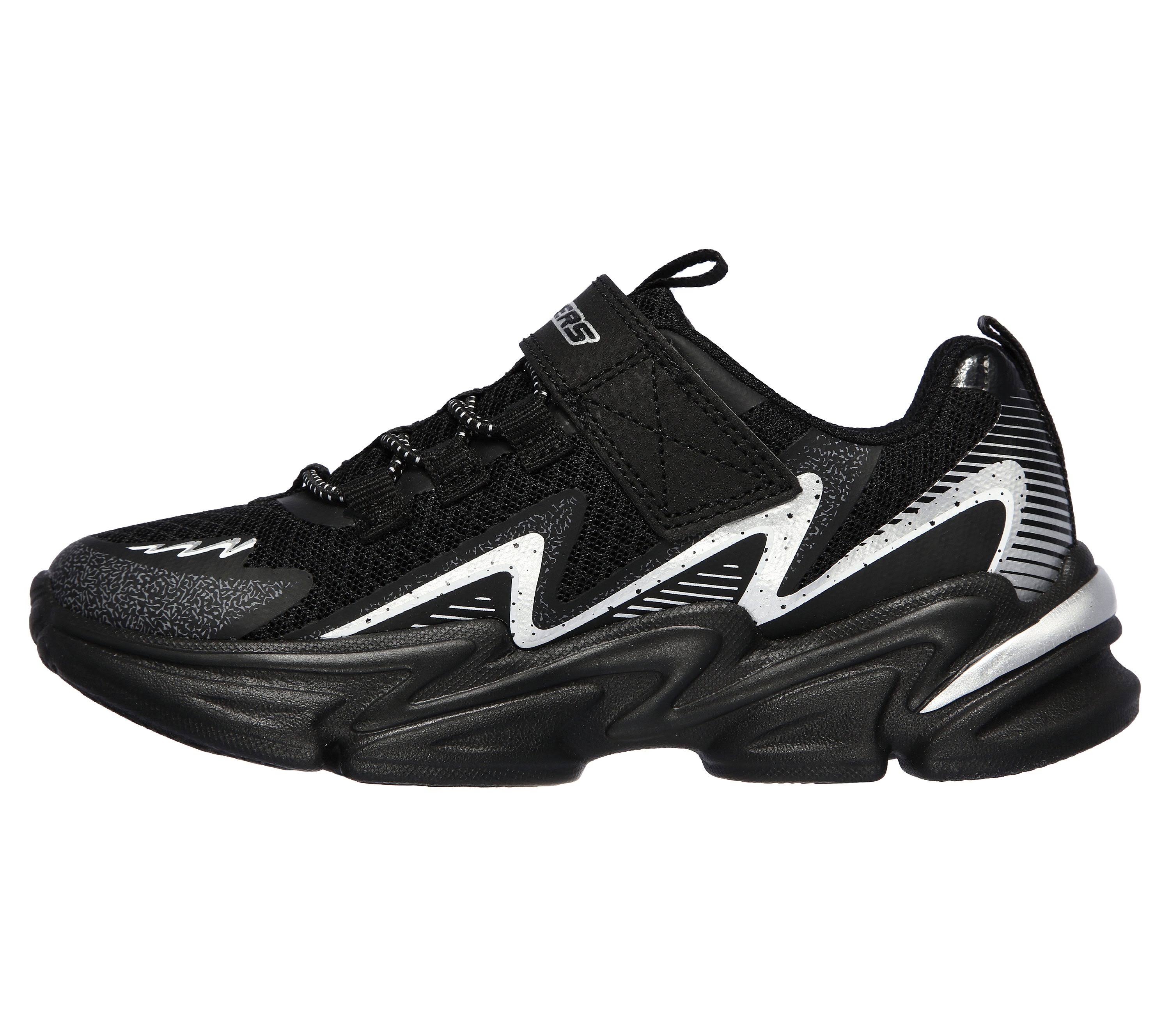 Sporty style and comfort takes a new shape with the Wavetronic black/ silver strap sneakers from Skechers. Featuring a woven mesh fabric and smooth synthetic upper in a slip on stretch laced athletic sporty training sneaker with stitching and overlay accents. Sculpted wave shaped midsole design. Hot-melt sleek wave designs on side panels.