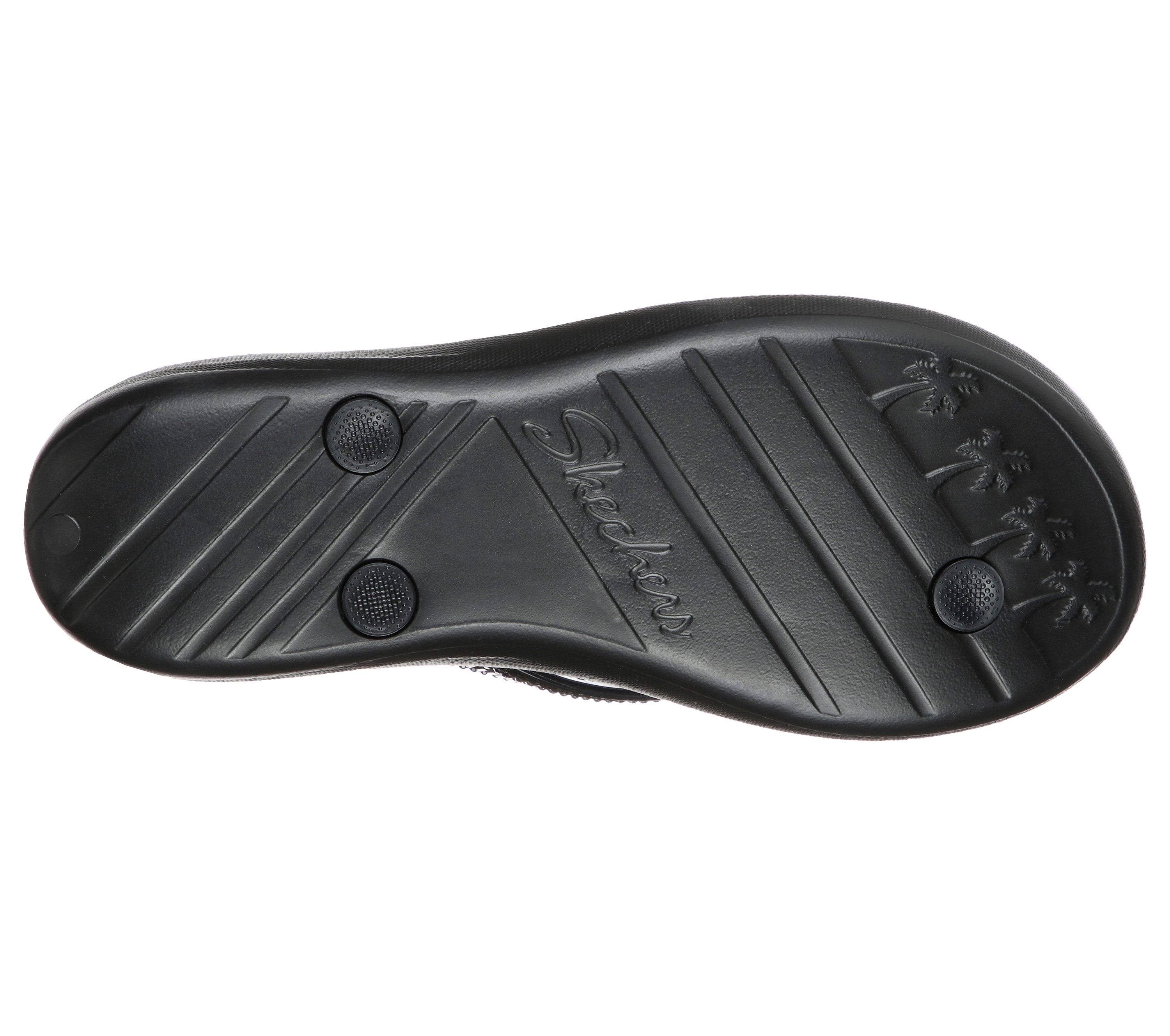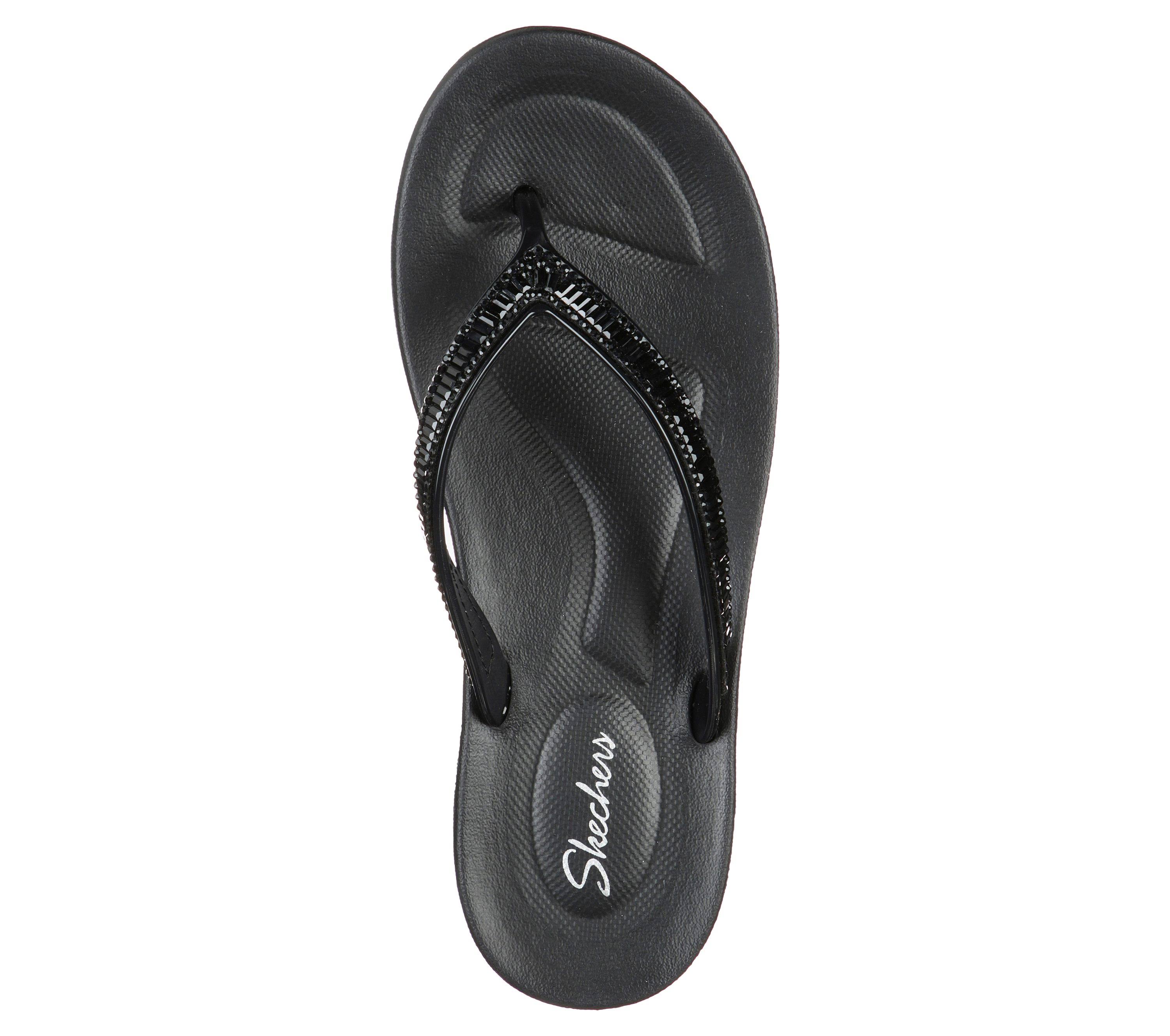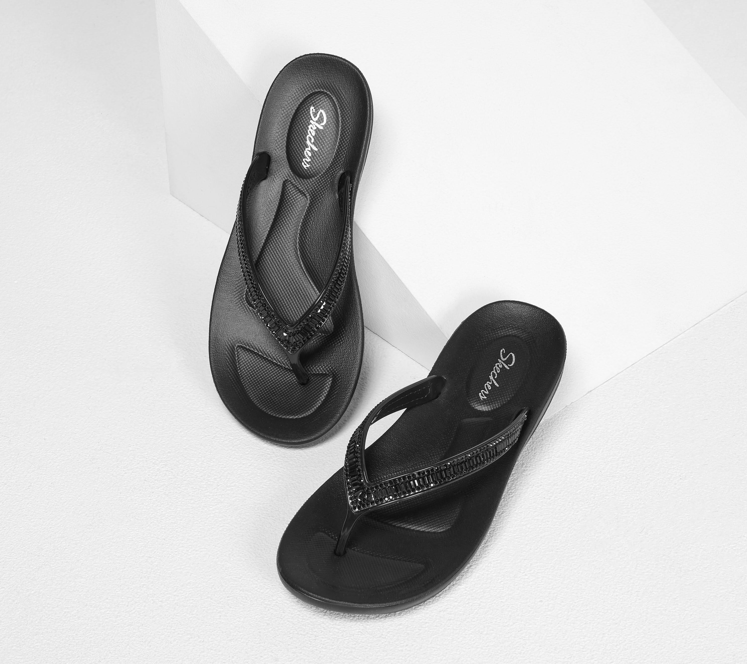 Sparkling style takes the plunge with the Skechers Cali Bungalow - Poolside Summer sandal. One piece soft jelly synthetic upper in a casual comfort flip flop thong sandal with glittering rhinestone accents and cushioned contour sole.