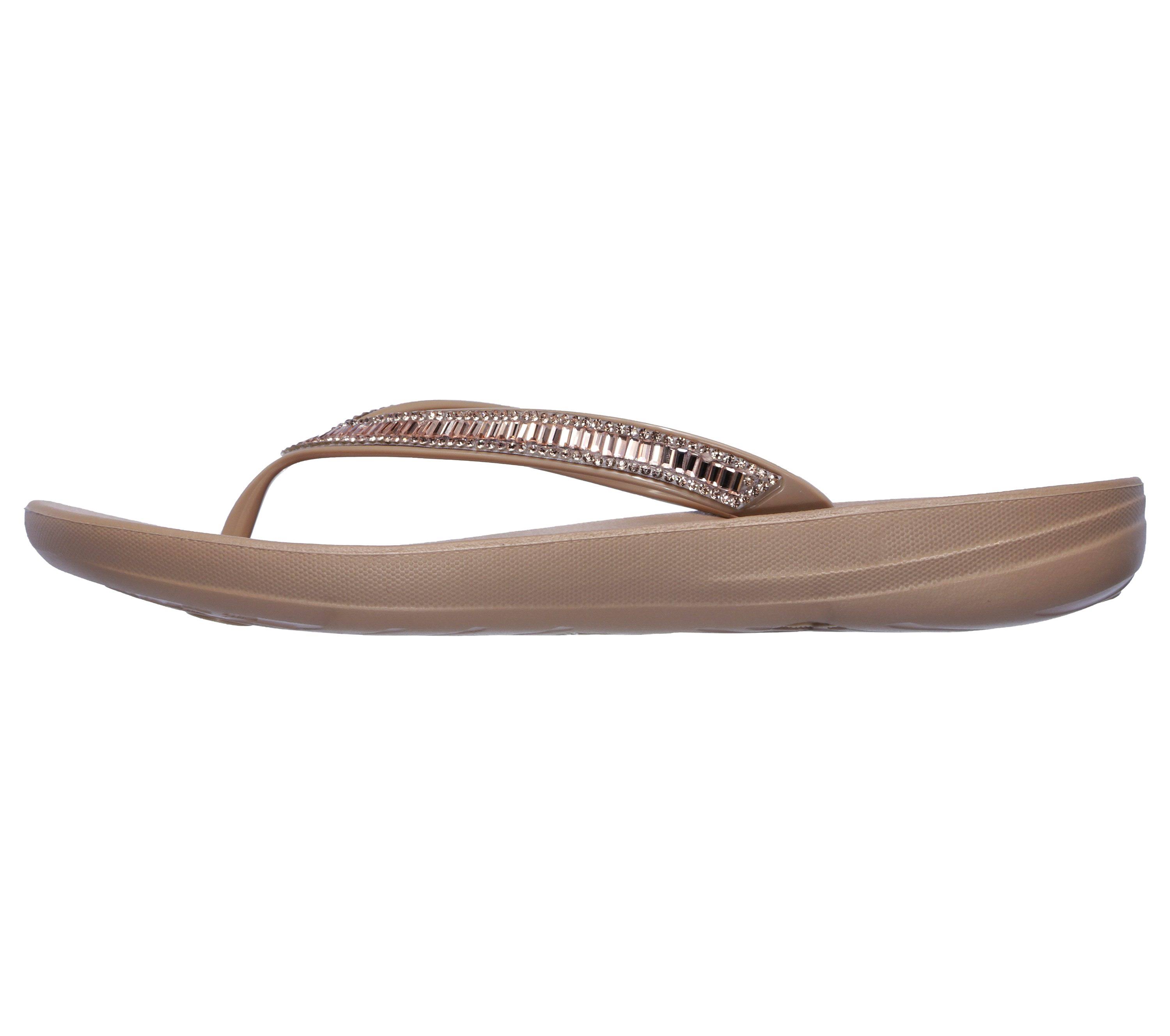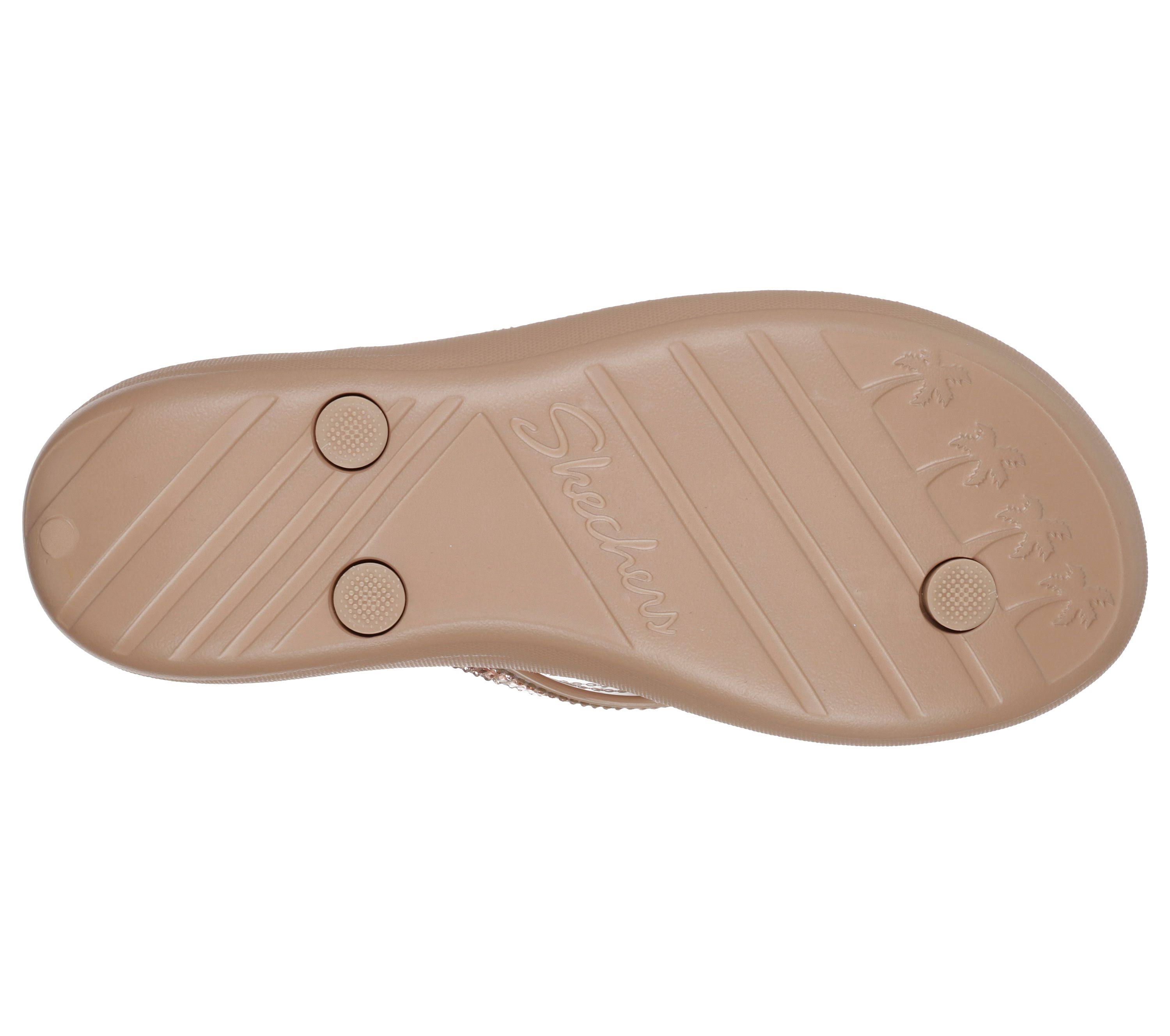 Sparkling style takes the plunge with the Skechers Cali Bungalow - Poolside Summer sandal. One piece soft jelly synthetic upper in a casual comfort flip flop thong sandal with glittering rhinestone accents and cushioned contour sole.