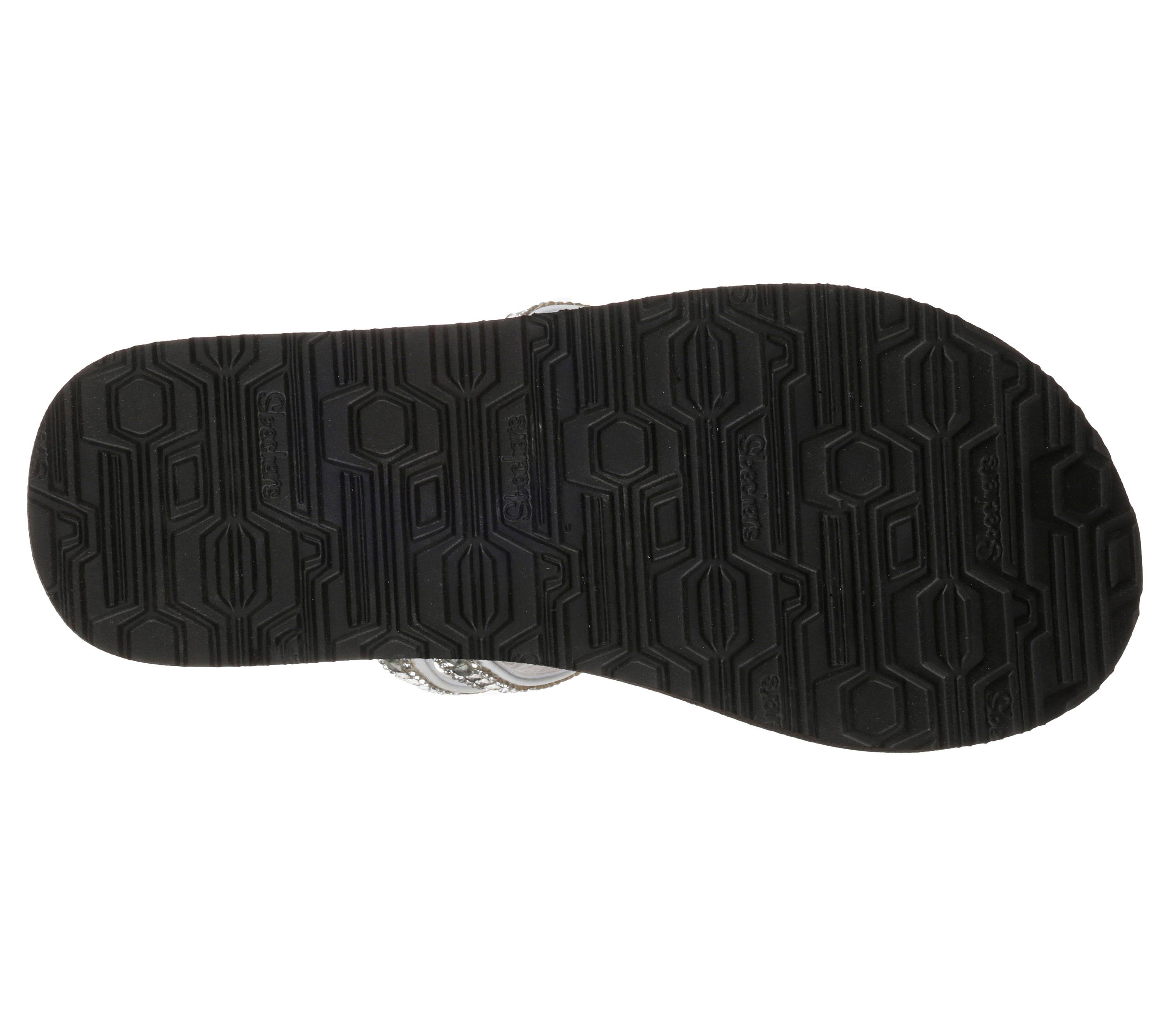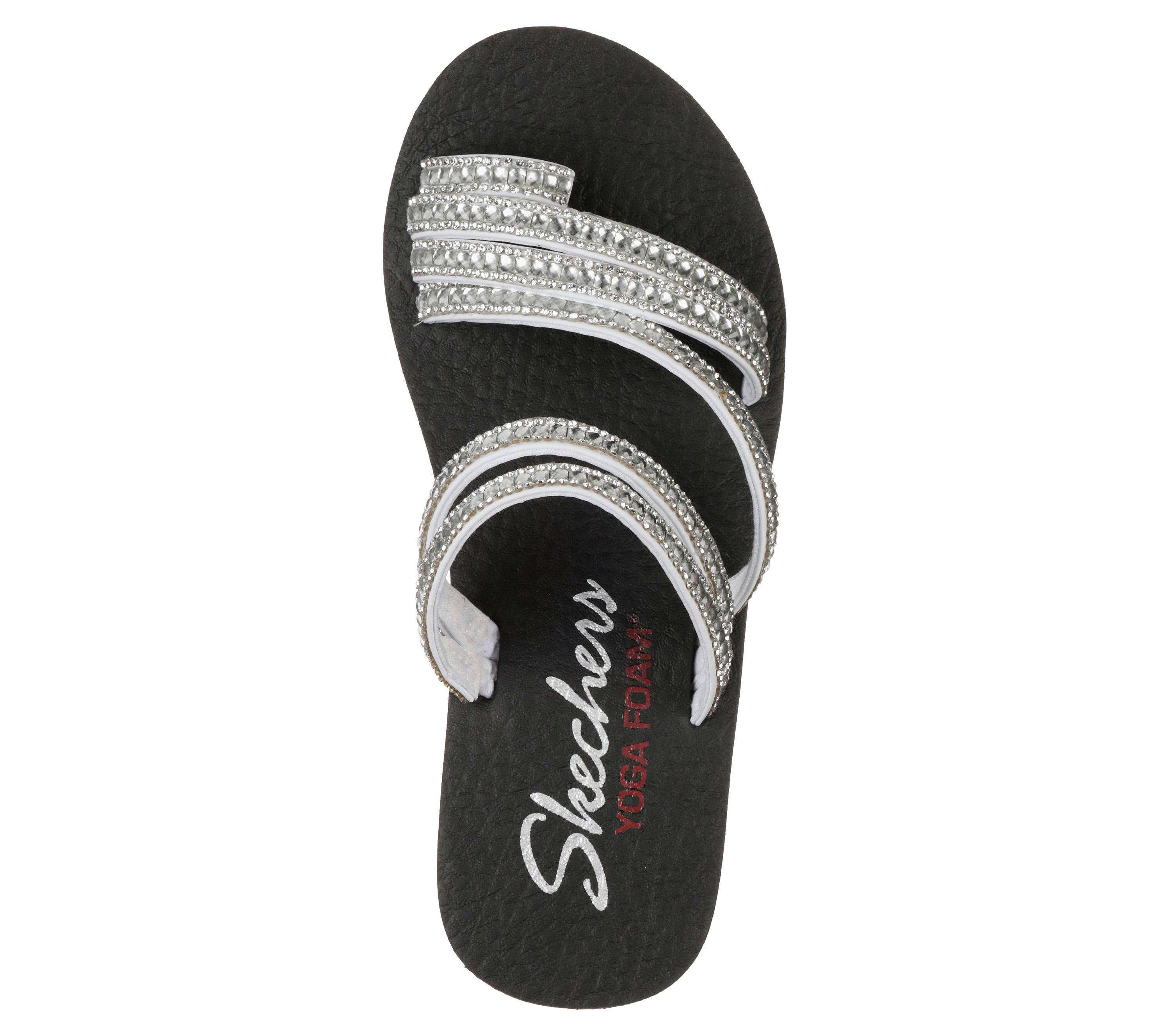 Add some gorgeous glitter to your summery style with the SKECHERS Cali Meditation - Glam Flash Toe Loop Sandal. Smooth synthetic upper in a casual comfort strappy toe ring thong sandal design with rhinestone detail and YOGA FOAM footbed. Pretty glittering two-color rhinestone designs on straps Faceted round rhinestones in rows bordered by smaller top and bottom rhinestone row detail Soft fabric toe post Soft fabric strap lining YOGA FOAM cushioned comfort footbed Lightweight flexible midsole Flexible traction outsole.