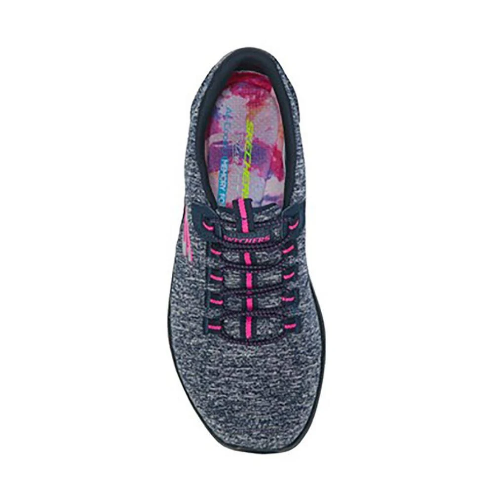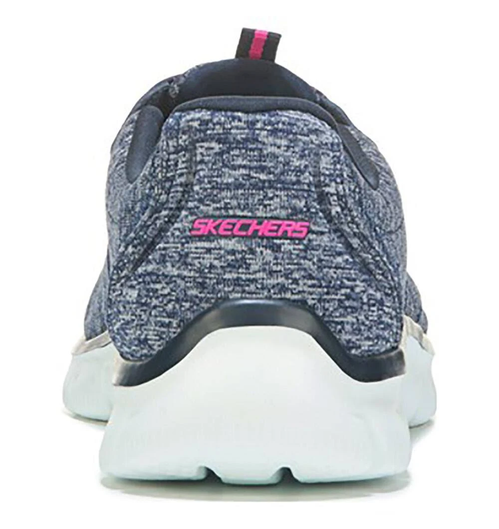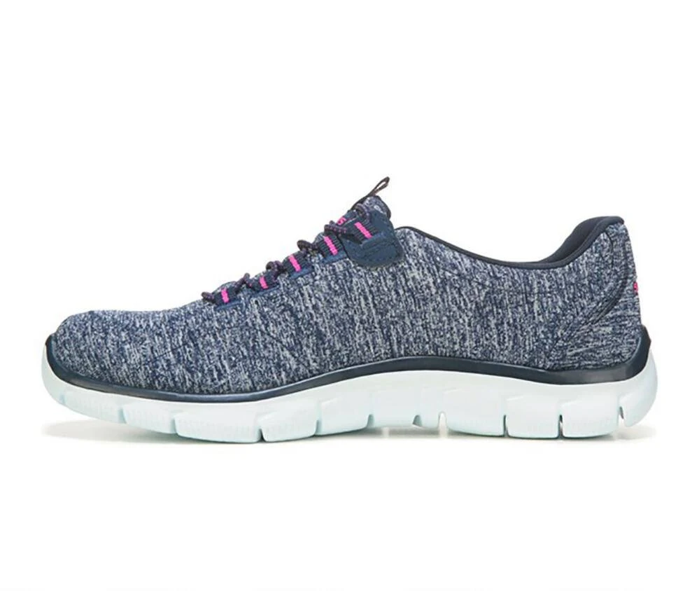 You come alive with every step in these women's Relaxed Fit Heart-to-Heart sneakers from SKECHERS. Featuring heathered navy blue knit and hot pink accents, these lightweight slip-on shoes offer bungee laces for a snug fit. The flexible design includes air-cooled memory foam cushioning to invigorate your feet throughout the day.
