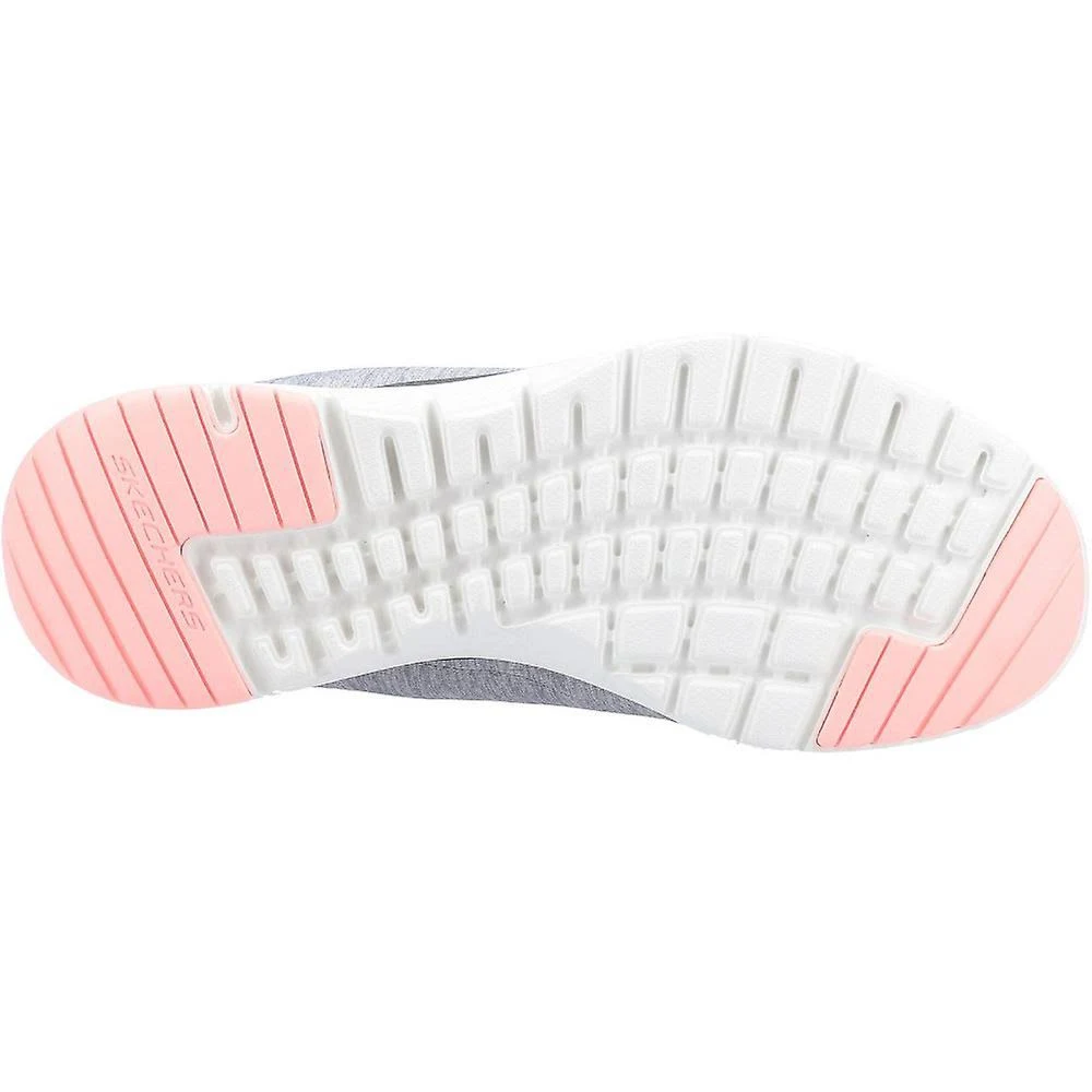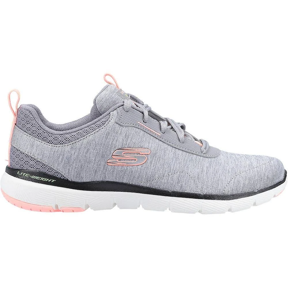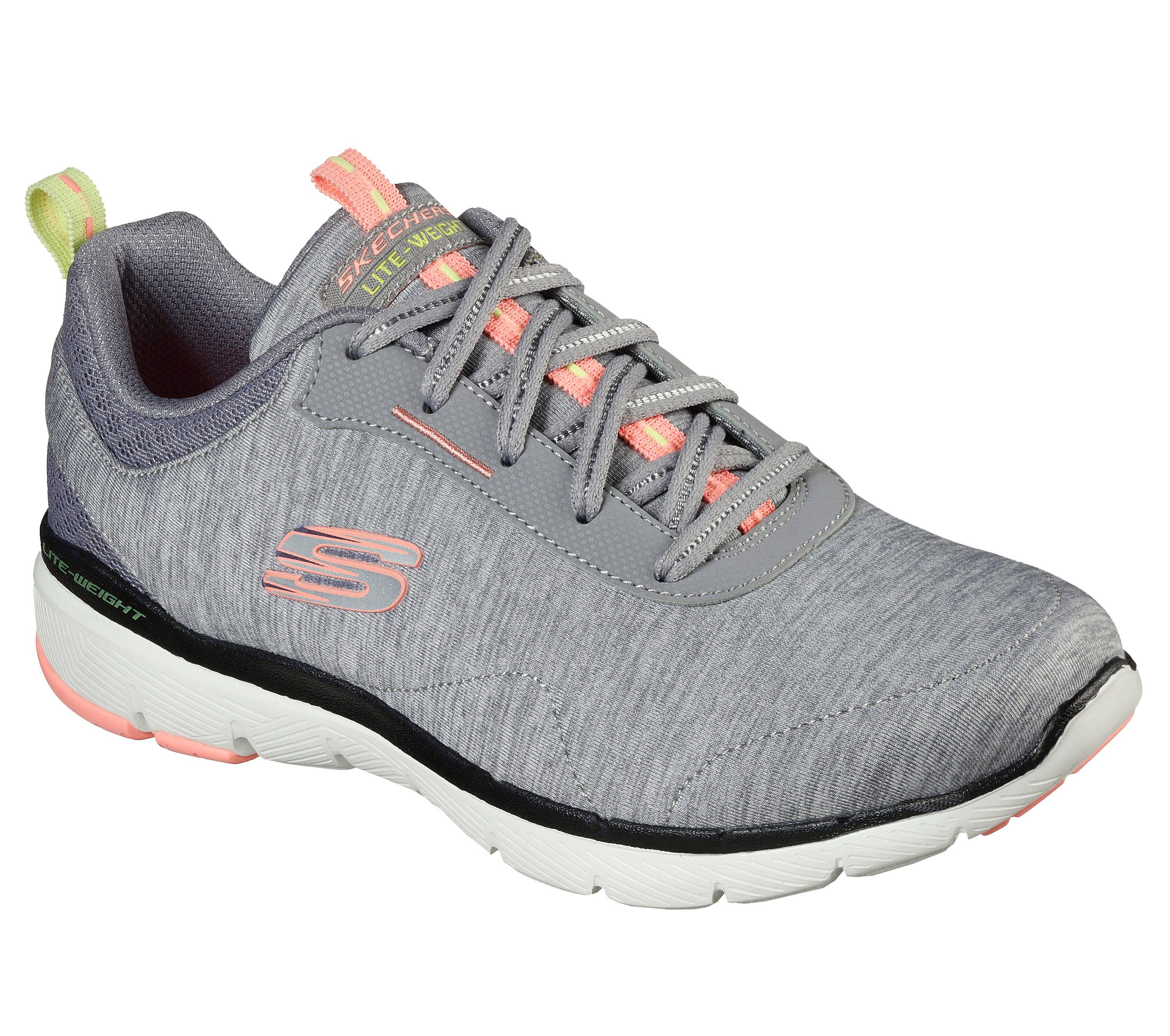 SKECHERS Womens Flex Appeal 3-0 Steady Energy fashion sneakers feature a soft heathered athletic finish mesh nearly one piece fabric upper. Lace-up front for a secure fit. Padded collar and tongue. Soft fabric shoe lining. Air Cooled Memory Foam cushioned comfort insole. Air Cooled lightweight shock absorbing midsole. Super flexible traction outsole with 1 inch heel. Machine Washable design - Gentle Cycle cold hang to air dry.