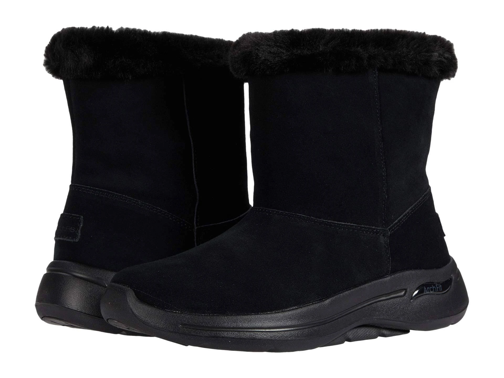 Made in USA or Imported Synthetic sole Platform measures approximately 1 Soft suede uppers are treated with 3M Scotchgard to repel water and stains Slip-on mid-calf style winter boot Soft faux fur shaft lining and soft fabric boot socklining Lightweight, responsive ULTRA GO cushioning with Air Cooled Goga Max technology insole Arch Fit design with anatomically designed support Women's Skechers, GOwalk Arch Fit - Embrace Boot. You'll enjoy the lightweight and supportive design of this cozy winter boot. The responsive ULTRA GO cushioning and contoured Arch Fit footbed design offer the ultimate in walking comfort. Soft suede uppers are treated with 3M Scotchgard to repel water and stains Slip-on mid-calf style winter boot Soft faux fur shaft lining and soft fabric boot socklining Lightweight, responsive ULTRA GO cushioning with Air Cooled Goga Max technology insole Arch Fit design with anatomically designed support. Heel Height of 1.50 inches. Platform Height of 1.00 inches.