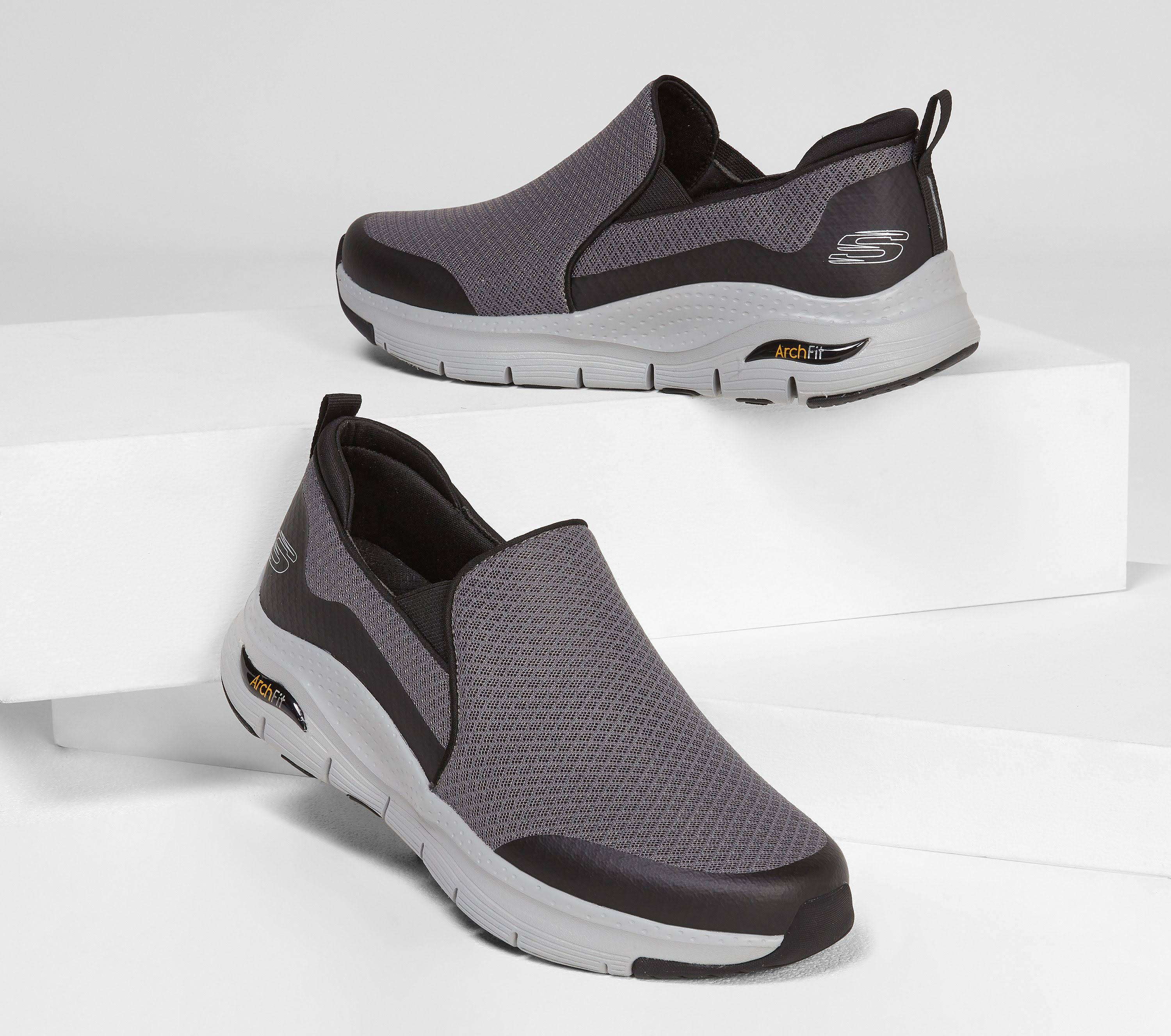 These amazing Skechers Arch Fit Slip On Sports Trainers can make your workout or walking sessions fun and relaxing. They are available with a textured mesh fabric upper for absolute breathability. The heel panel of the shoes is available with a top pull-on fabric loop. Their soft fabric lining can soak the moisture and make the shoes comfortable throughout the day., Soft woven athletic textured mesh fabric upper. Smooth synthetic hot-melt overlays at toe sides and heel for added durability., Slip on athletic sporty comfort walking sneaker design. Diamond pattern athletic mesh fabric with breathable finish., Heel panel with top pull on fabric loop. Fabric trim at instep and collar panels., Dual side stretch fabric panels for easy slip on fit. Padded collar., Soft fabric shoe lining. Arch Fit logo detail on midsole side panel.