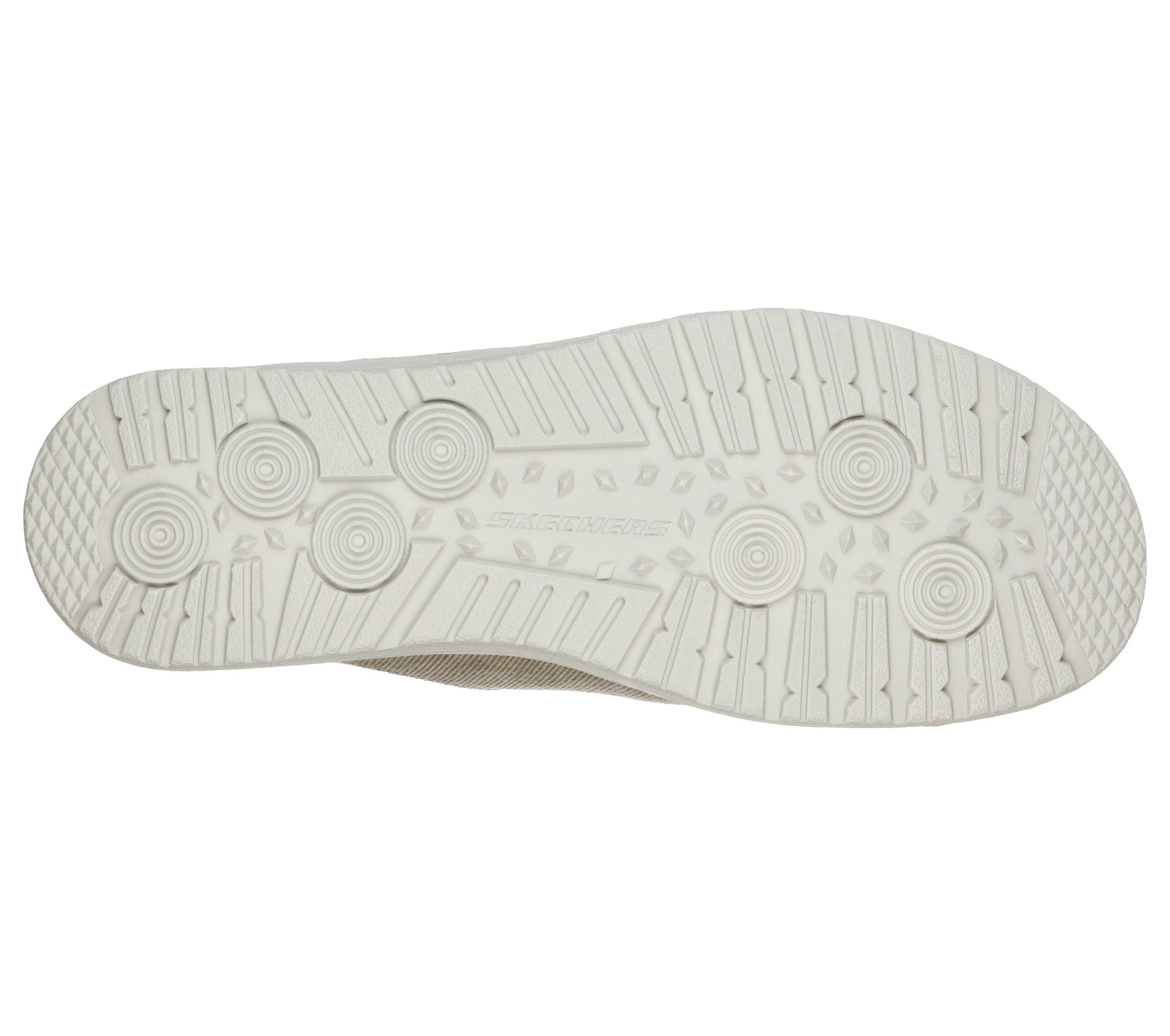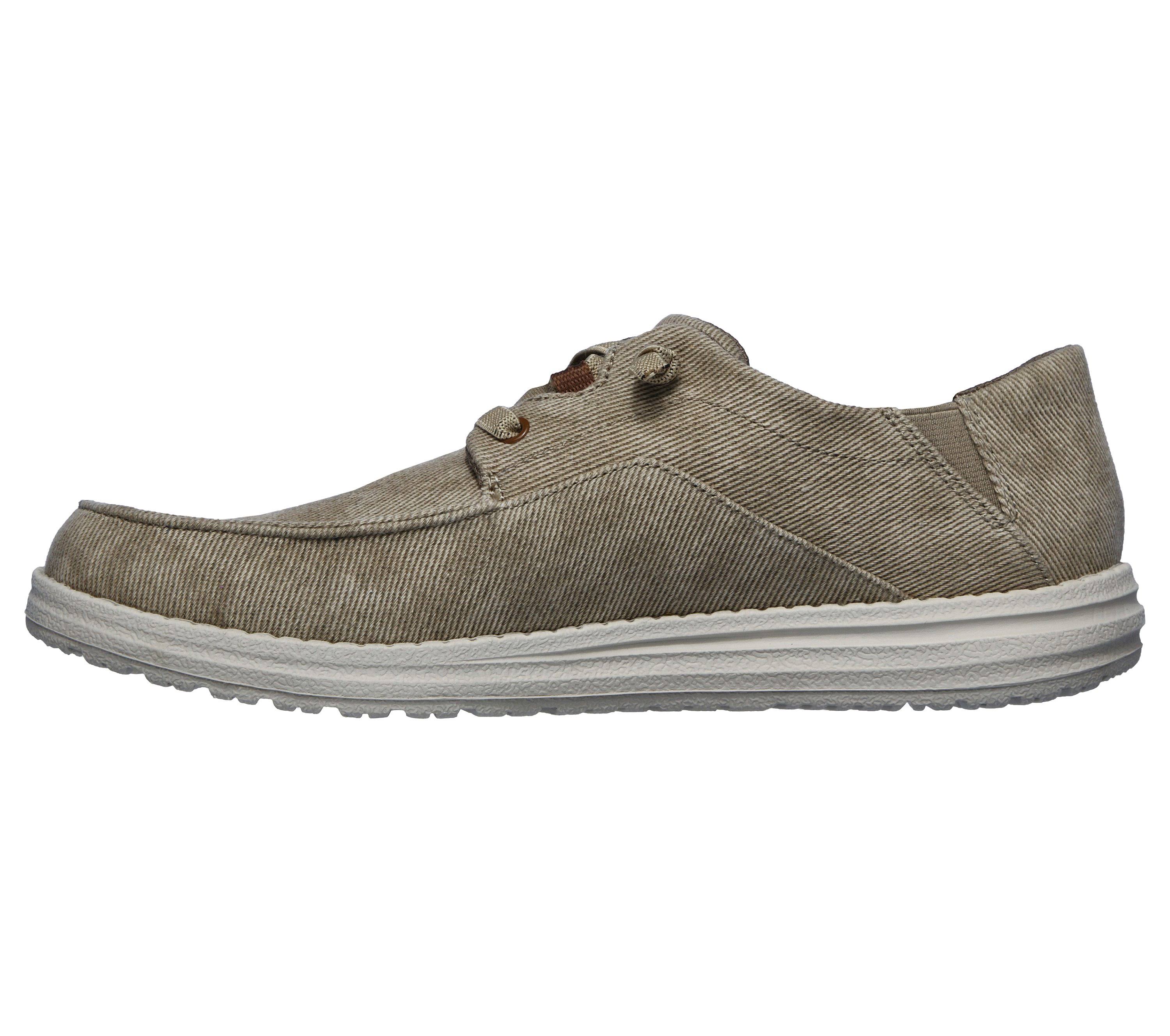 Answer the call of the beach style in the laid-back looks and comfort of the Skechers Melson - Volgo shoe. Soft woven canvas fabric upper in a slip on stretch laced casual beach moc with stitching and overlay accents. Air Cooled Memory Foam insole.