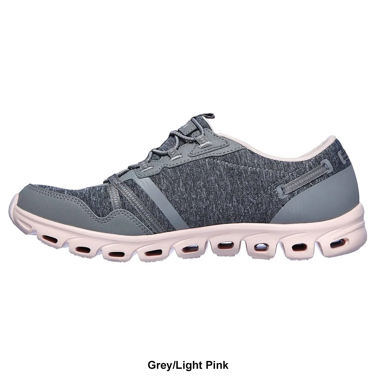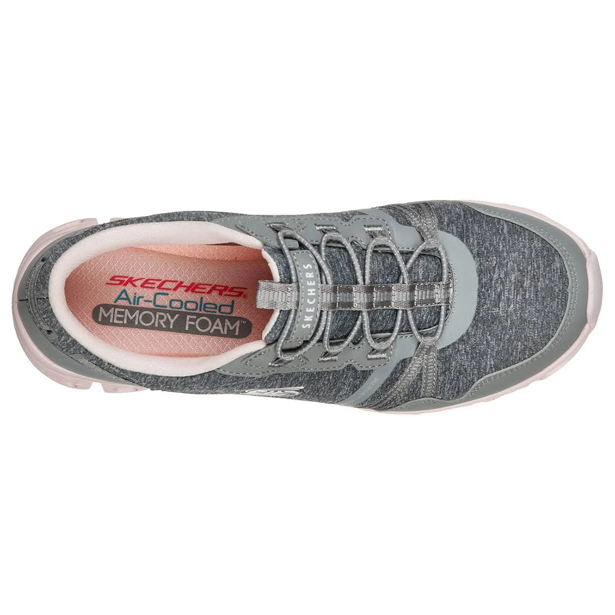 Move with ease and comfort during your busy activities wearing the Skechers Glide Step - Stepping Up shoe. This bungee-laced slip-on sneaker features a soft heathered knit and synthetic upper with an Air-Cooled Memory Foam comfort insole and Glide-Step geometric cushioned midsole. Air-Cooled Memory Foam comfort insole. Glide Step geometric midsole designed to provide natural momentum with every step. Slip-on style with a bungee-laced front. Soft heathered knit and synthetic duraleather upper. Super flexible rubber traction outsole. Machine washable. 12-inch heel. Skechers logo detail. Imported.