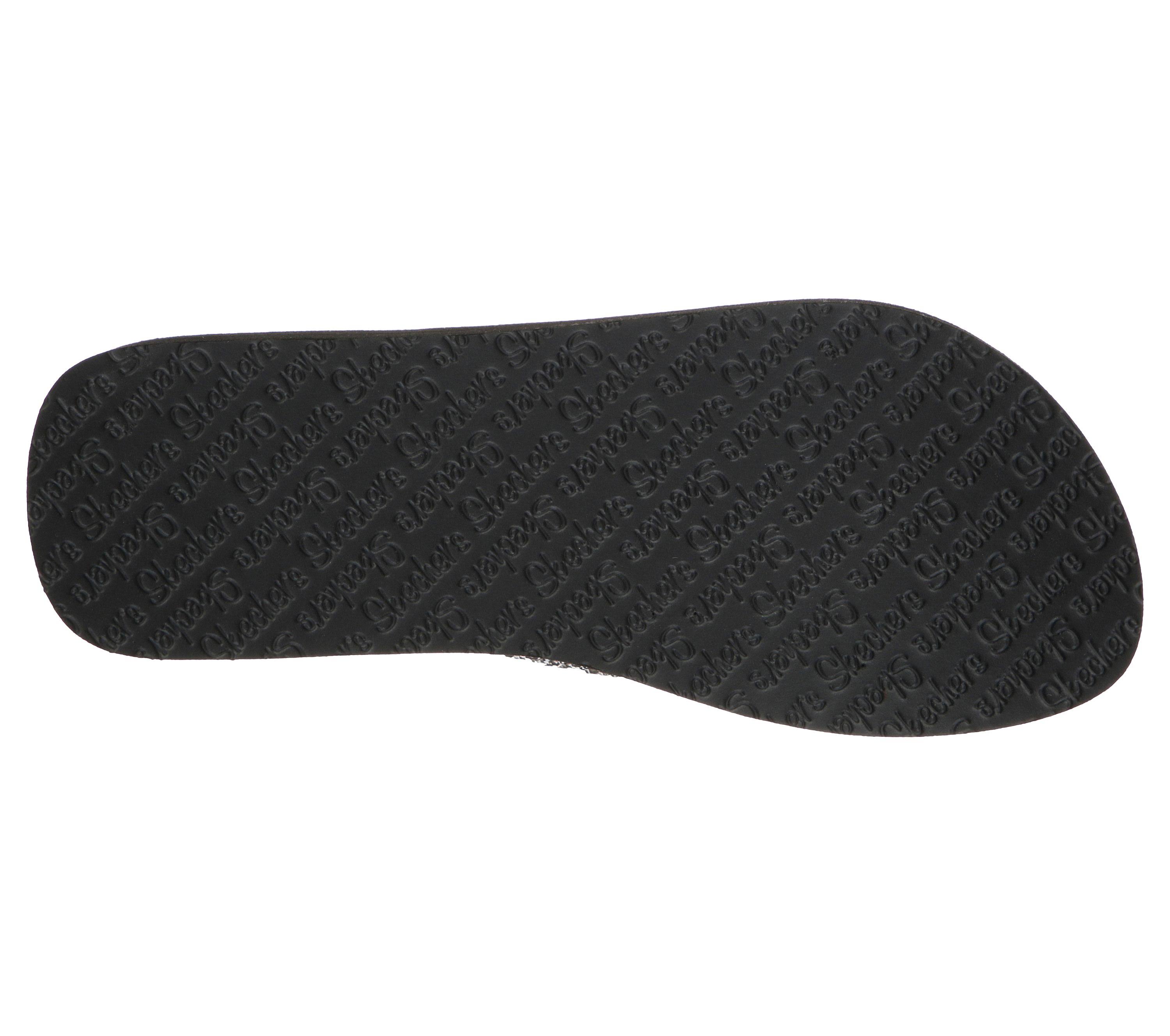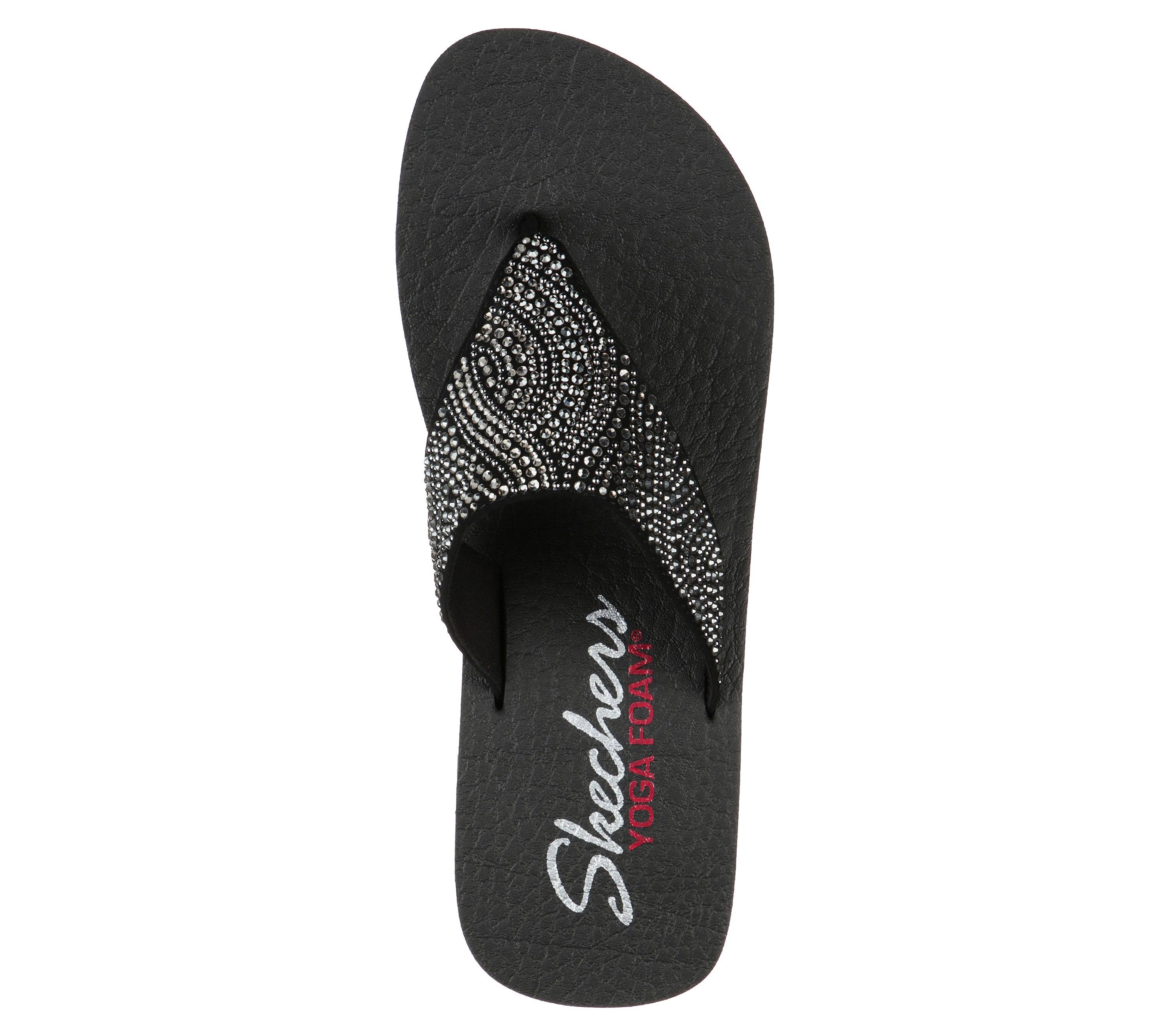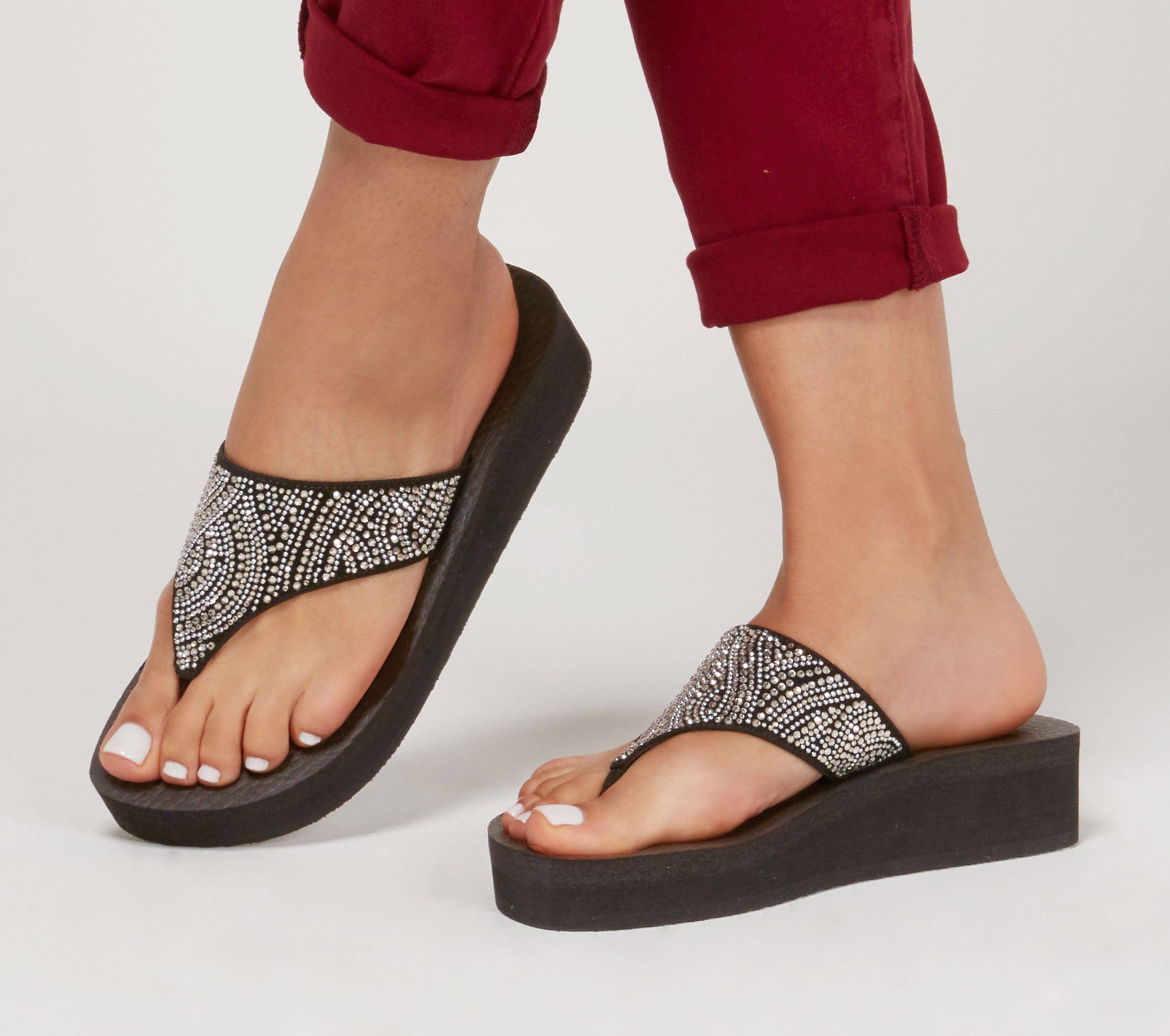 Make sure to sparkle in the sunshine with added comfort in the SKECHERS Cali Vinyasa - Stone Candy sandal. Smooth synthetic upper with sparkling mini rhinestone detail in a low wedge heeled flip flop casual thong sandal. YOGA FOAM comfort footbed. Smooth synthetic upper Low wedge heeled casual flip flop thong sandal design Stitching accents Glittering mini rhinestone designs on upper Rhinestones with curved designs and sparkling faceted shapes Soft rolled toe post Soft fabric strap lining YOGA FOAM cushioned comfort footbed Lightly textured footbed with SKECHERS print logo Lightweight flexible supportive midsole 1 1/2 inch wedge heel height Flexible traction outsole.