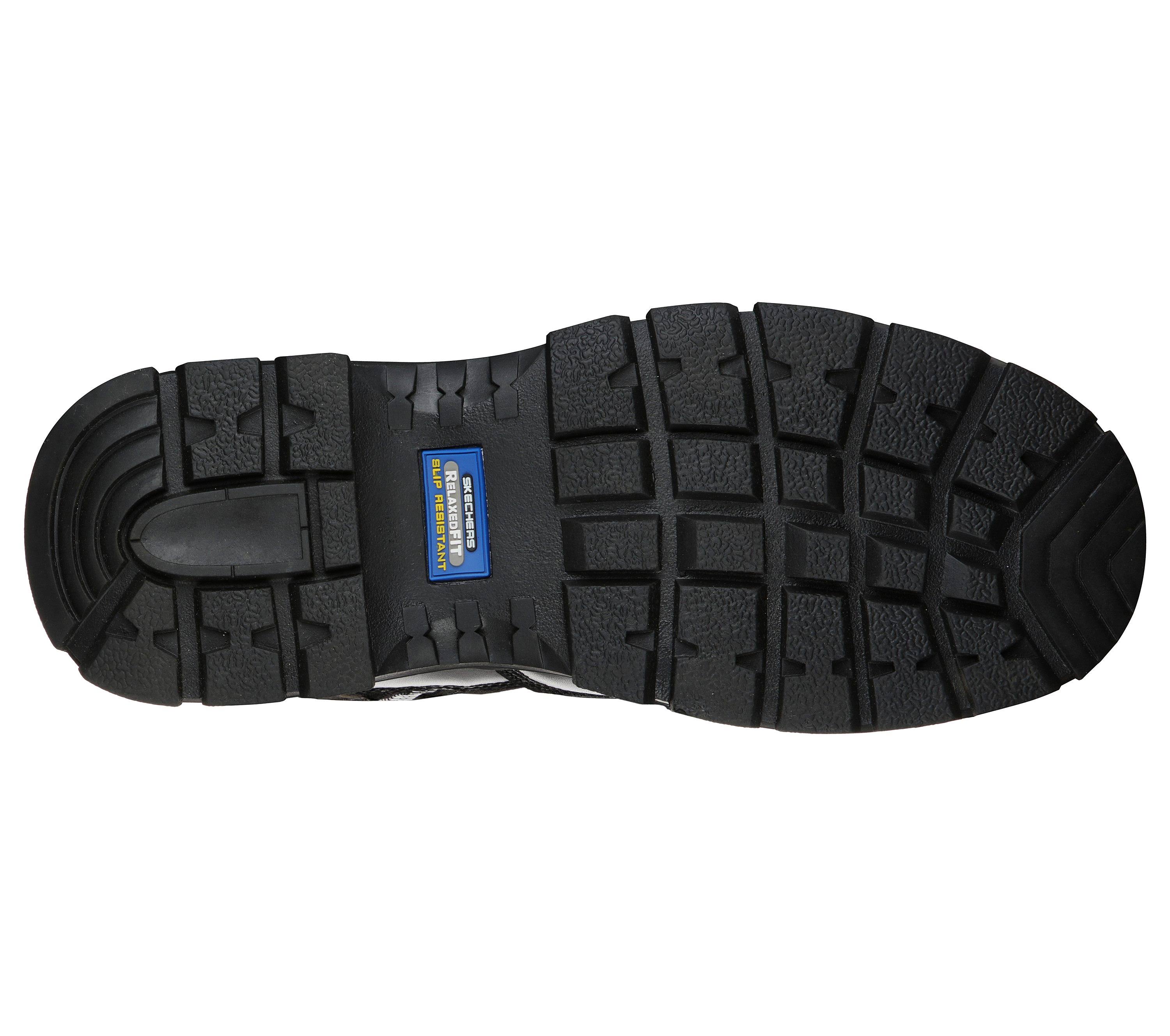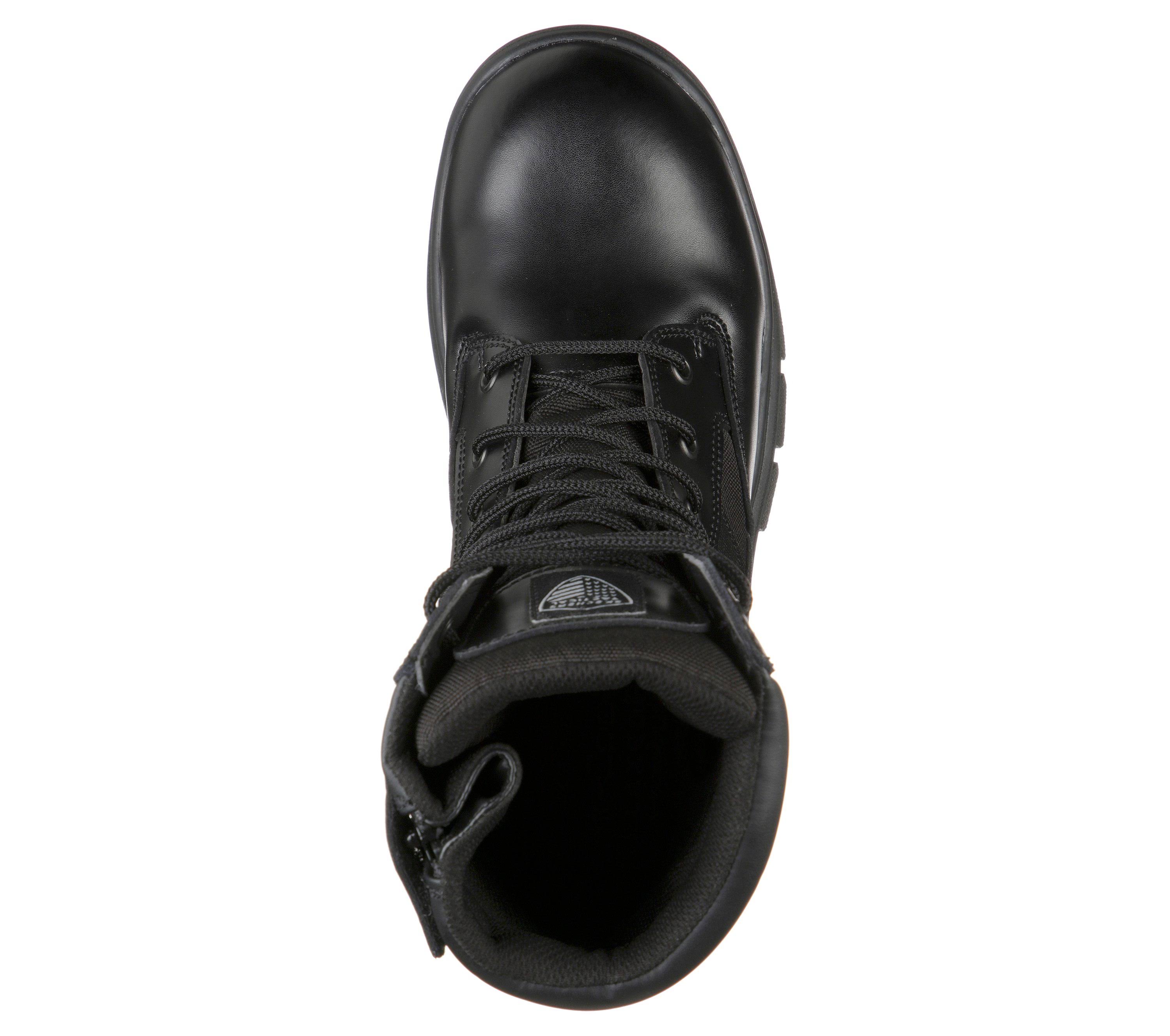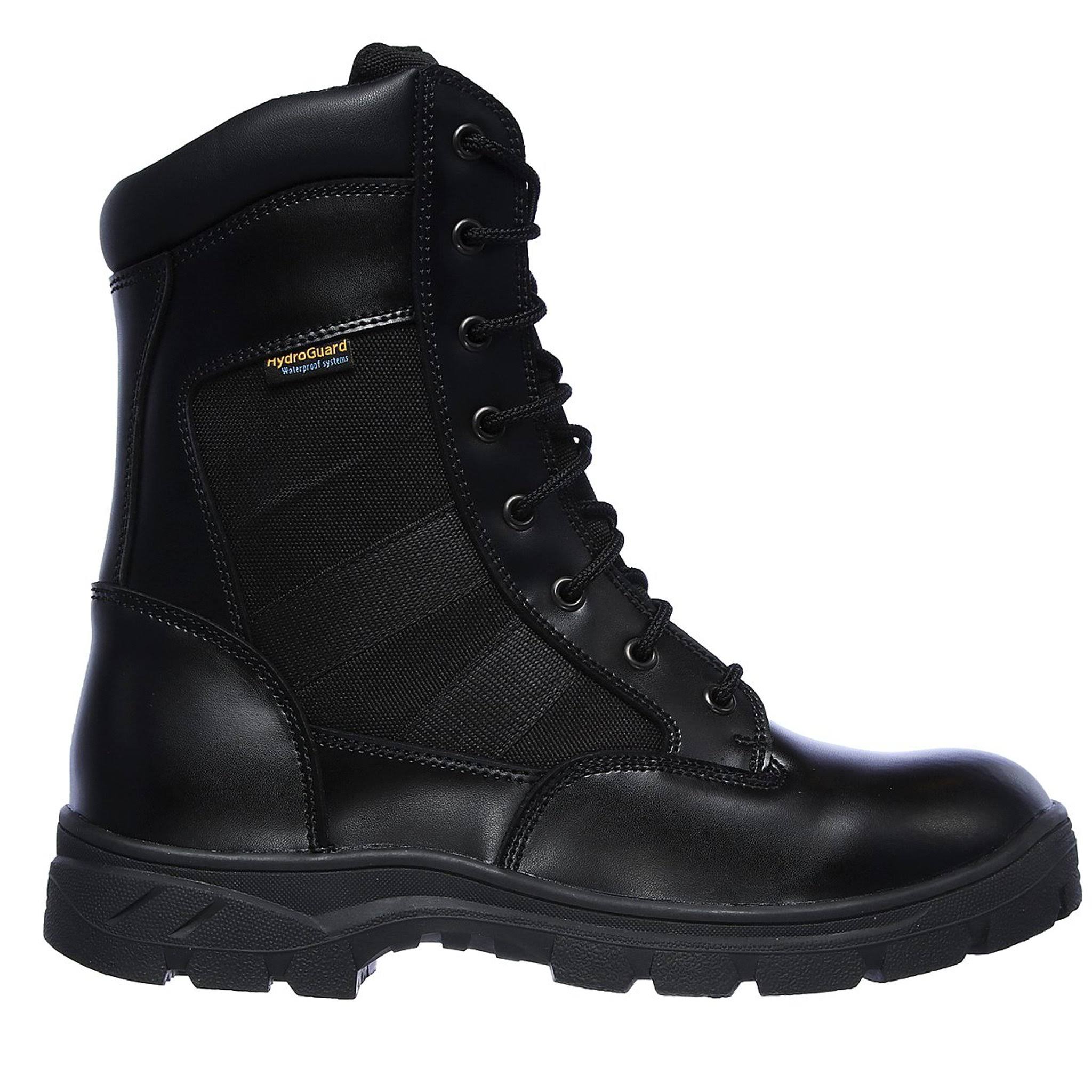 Upgrade your service boot with amazing comfort and safety features in the SKECHERS Work Relaxed Fit: Wascana - Athas Tactical Boot. Smooth leather and cordura mesh fabric upper in a ace up mid calf height waterproof tactical boot with Memory Foam insole. Electrical Hazard (EH) Safe design EH Safe tested ASTM F2892-11 for safety Waterproof seam sealed upper design. Durable cordura mesh fabric panels at sides for cooling effect Rounded plain toe front Leather overlays at sides and heel with double-stitched reinforced seams Reinforced cordura side panels with stitching detail Lace up front with metal eyelets Full length side zipper for easy access Top strap holds zipper in place with hook and loop closure Fabric gusset panels at tongue and side zipper Padded collar and tongue 8 inch shaft height Tactical-cut collar for added comfort and flexibility Soft fabric boot lining Relaxed Fit design for roomy fit at toe and forefoot Memory Foam full length cushioned removable comfort insole Shock absorbing lightweight flexible midsole Slip resistant rugged lug-textured rubber traction outsole.