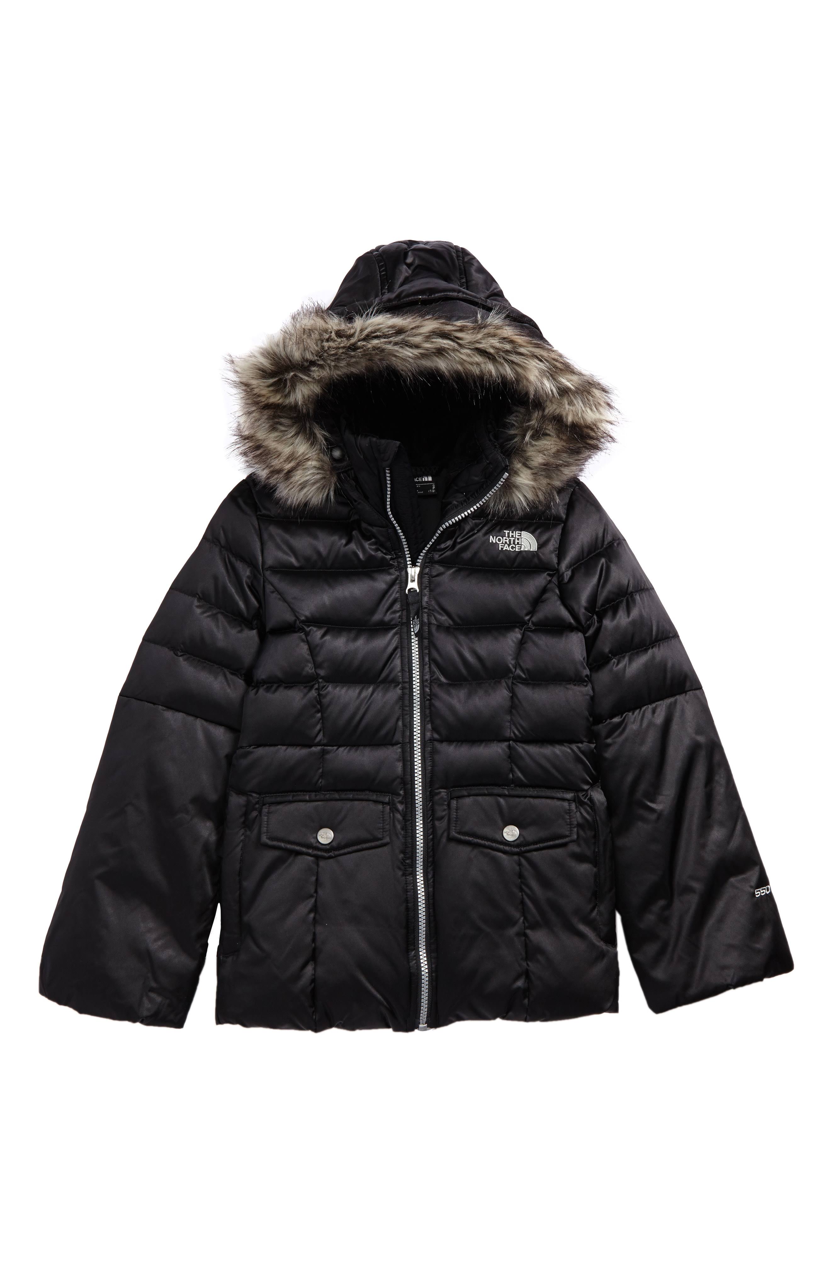 A channel-quilted jacket insulated with lofty 550-fill-power down is water-repellent to keep her cozy and dry when the temperature drops. An elastic inset at the waist keeps the fit close to her body for ease of movement, and a fleece-lined stand collar and insulated hood with faux-fur trim help keep chilly breezes at bay. Fleece-lined double entry pockets store mittens and snacks, while an interior media pocket lets her listen to her fave tunes. Style Number: 5335306.
