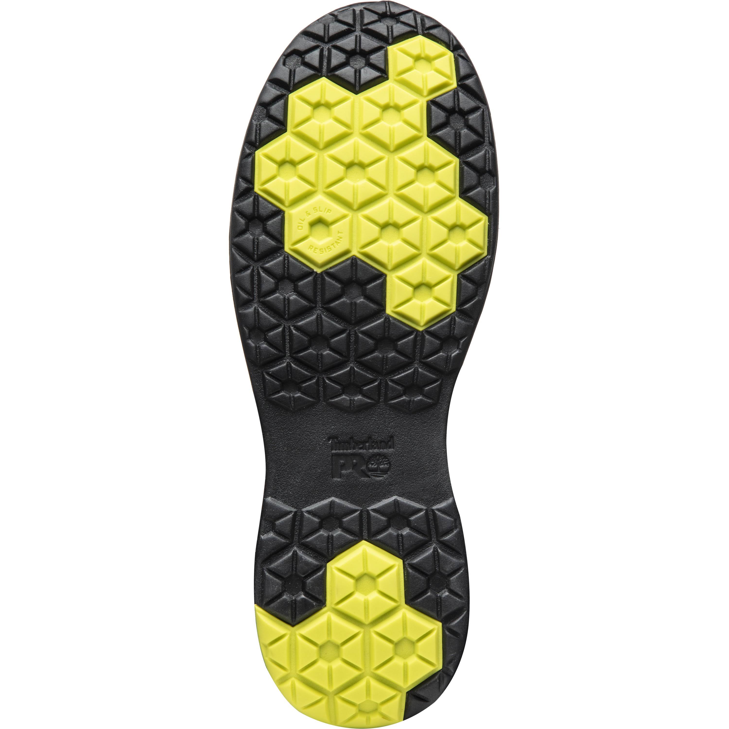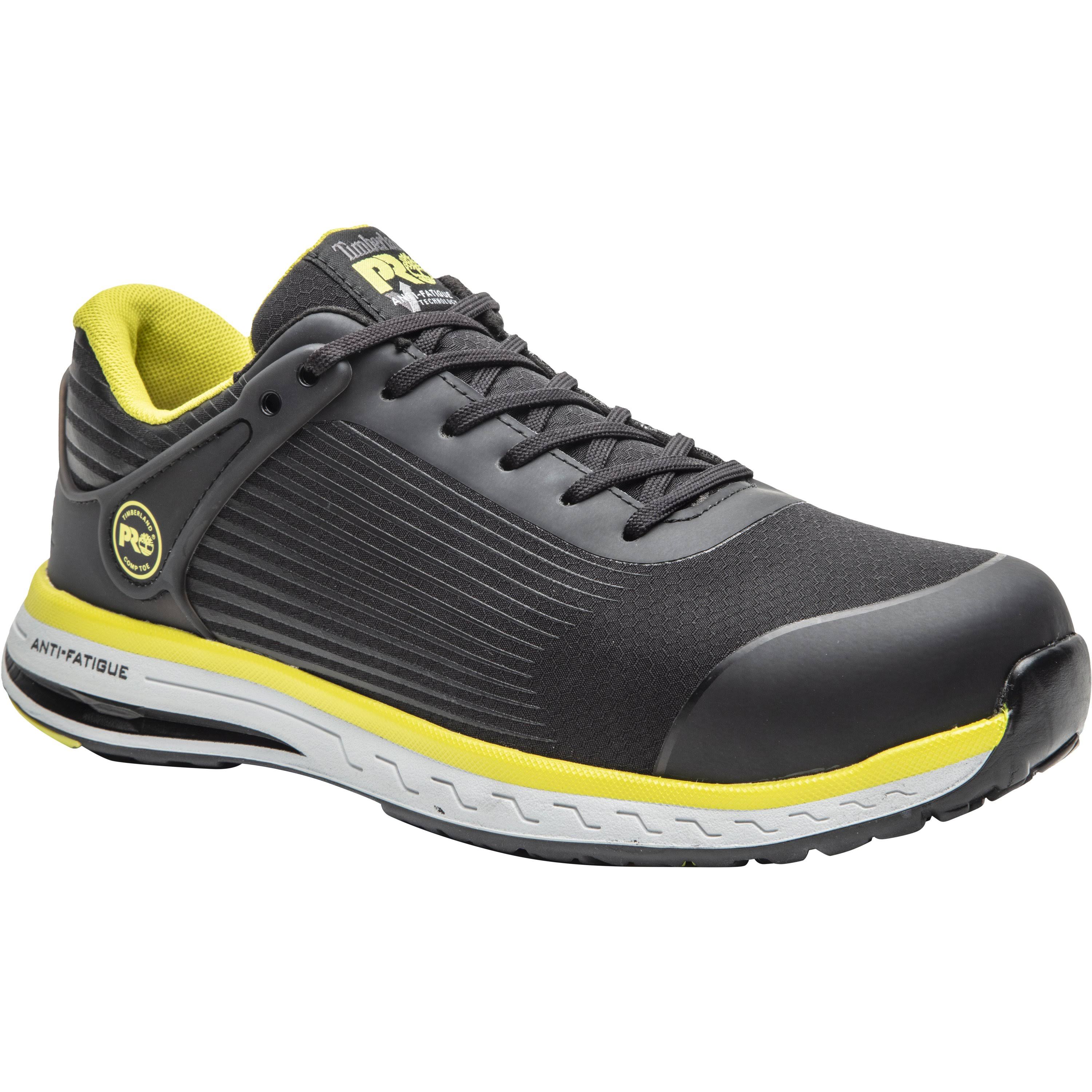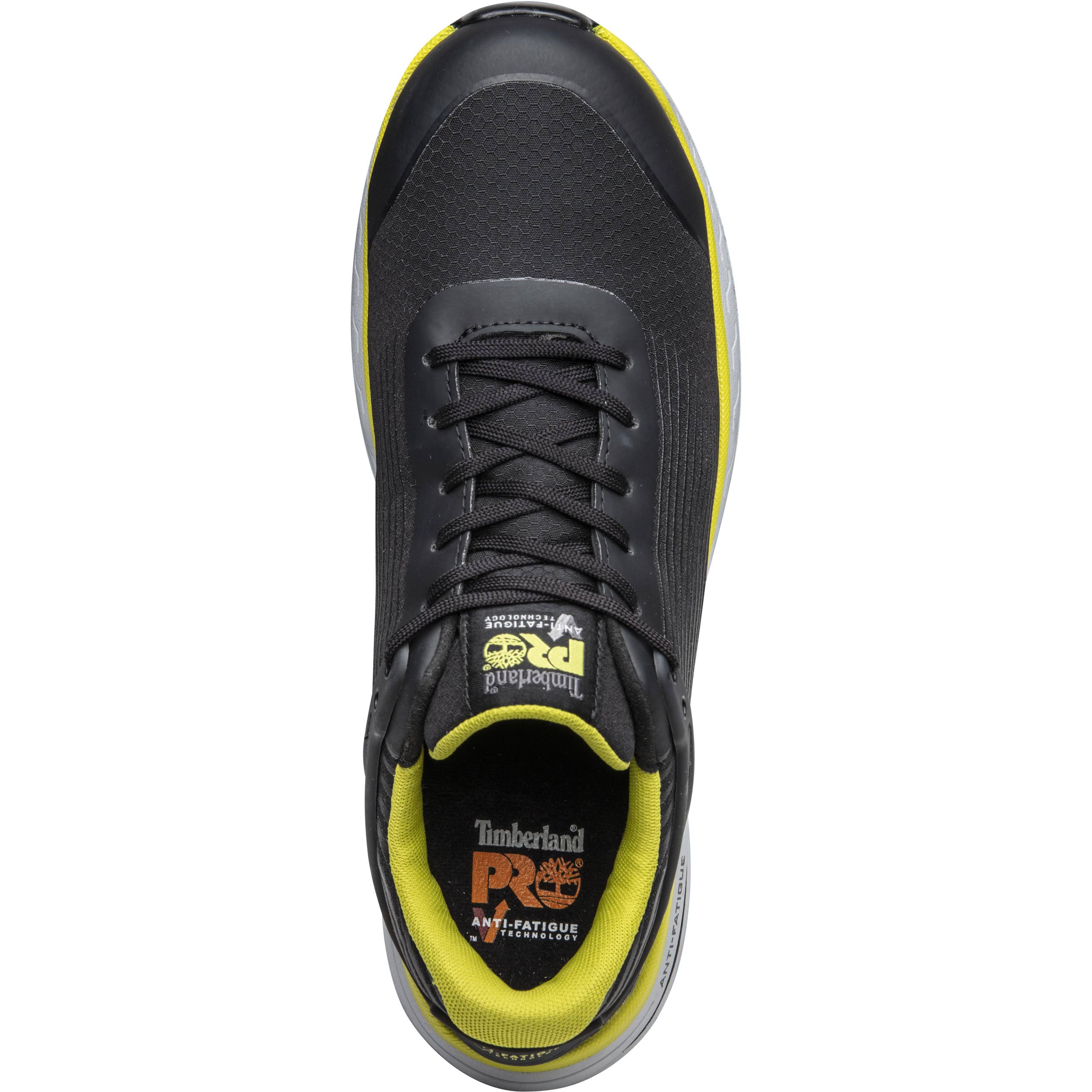 The Timberland PRO Drivetrain SD35 Athletic Work Shoe gives you the modern style you want with the safety features you need for a light industrial work setting. This all-black men's Drivetrain athletic work shoe has a distinctive nylon ripstop upper that is breathable and abrasion-resistant. TPU overlays strategically placed over the toe and heel provide scuff protection mitigating wear and tear. No metal components are so hardware is mutilation-free. They have an Anti-Fatigue Technology polyurethane footbed for shock absorption and energy return. They are also breathable and feature moisture-wicking lining with anti-microbial treatment for odor control.