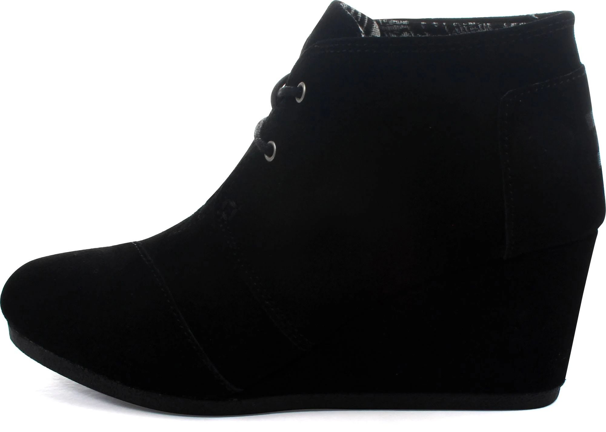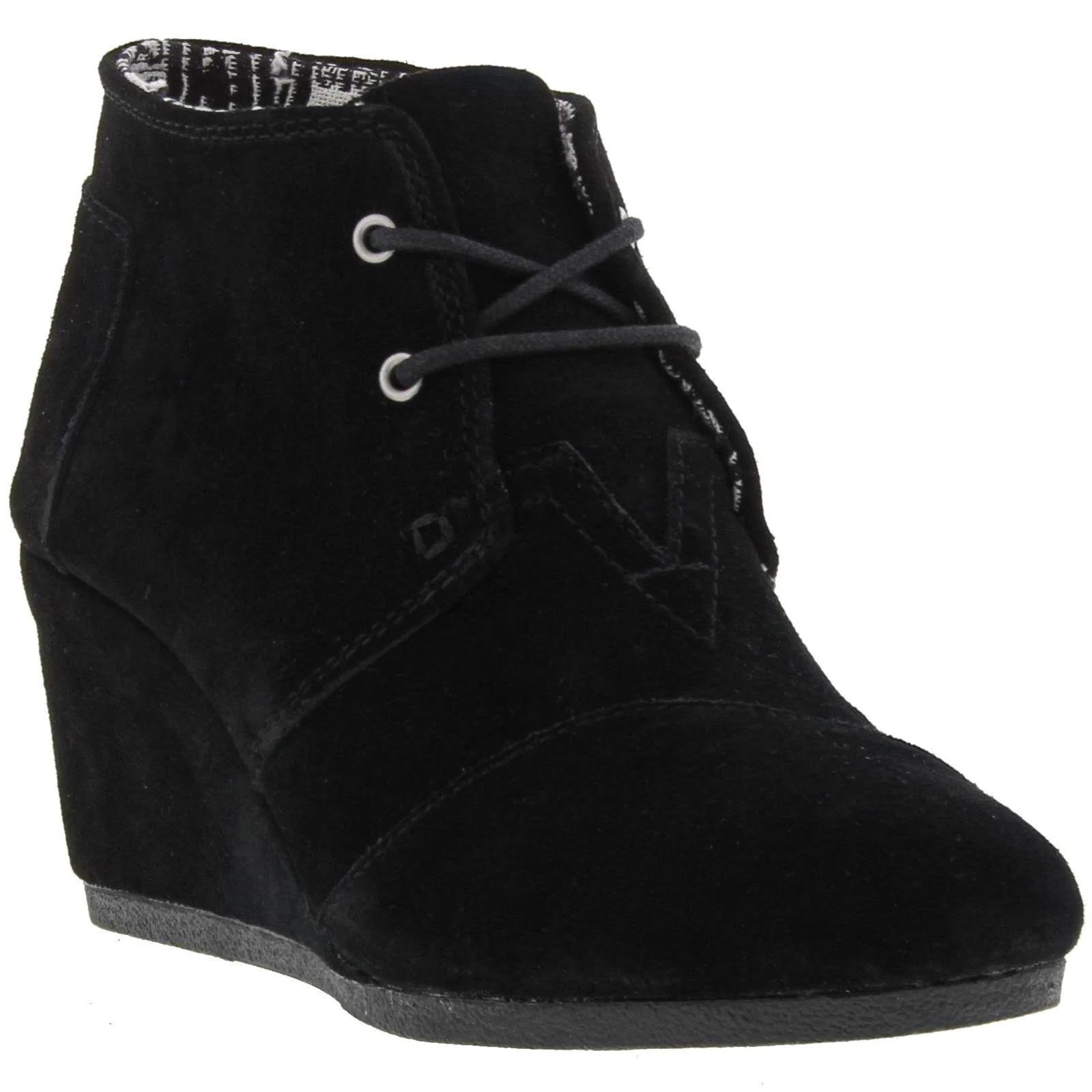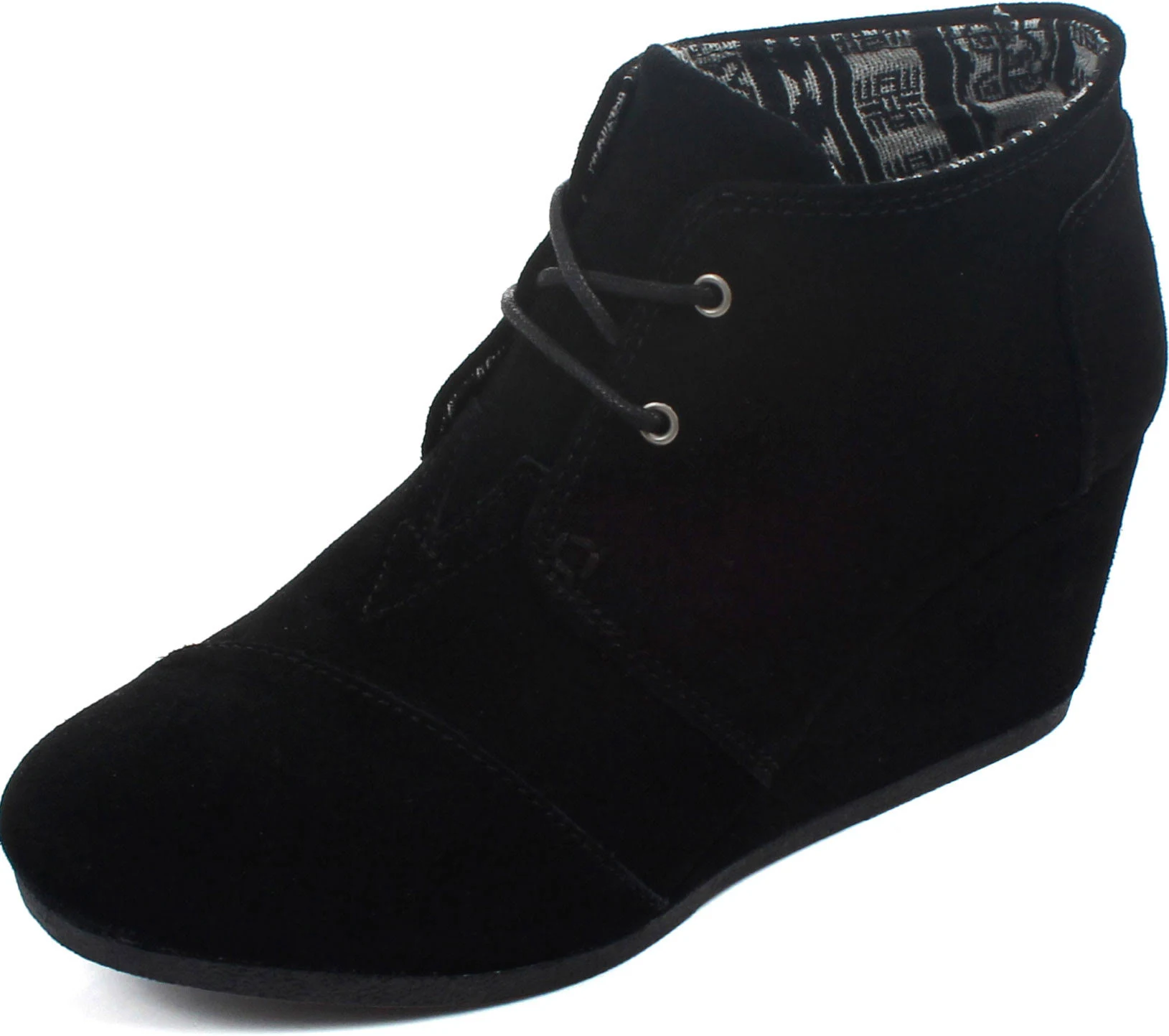 Stay on-trend with the TOMS Desert Wedge Bootie. This sleek style is designed with a suede upper and covered wedge heel for extra height without sacrificing stability. Two-eye lacing provides a secure fit. Patterned lining adds a whimsical finishing touch to the Desert wedge bootie. Plus, because of TOMS' One for One program every pair of TOMS you purchase means that TOMS will give a new pair of shoes to a child in need. Suede upper Covered wedge heel Lace-up Patterned antimicrobial liner One for One.