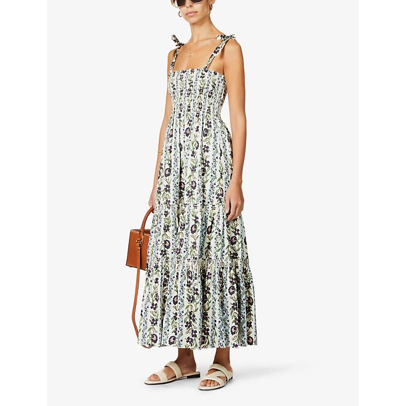 Tory Burch floral-print cotton-blend dress. Approx. 45L from shoulder to hem. Square neckline. Adjustable straps; self-ties. Smocked bodice. A-line silhouette. Tiered skirt. Ruffle hem. Slipover style. Cotton/nylon/Lycra Xtra Life spandex. Imported.