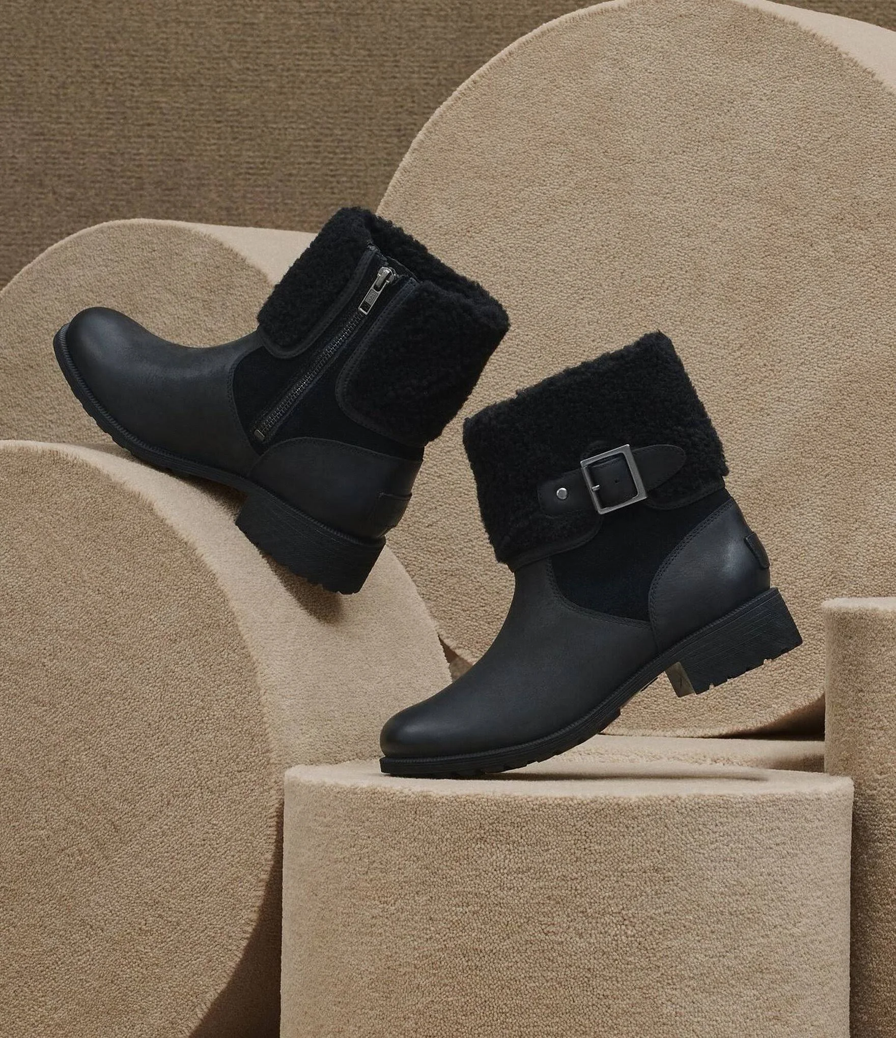 UGG Elings Boot, Black / Black, Size 9.5 - Cozy, elegant, and weather-ready, our Elings Boot is crafted from waterproof leathers with seam-sealed construction to help protect your feet from light rain and snow, keeping your shoes looking better for longer. Featuring a fluffy cuff and warm lining made from our ultra-soft UGGplush wool blend, it incorporates a functional buckle for cinching around jeans and leggings. Pair with dark denim and a sherpa jacket.