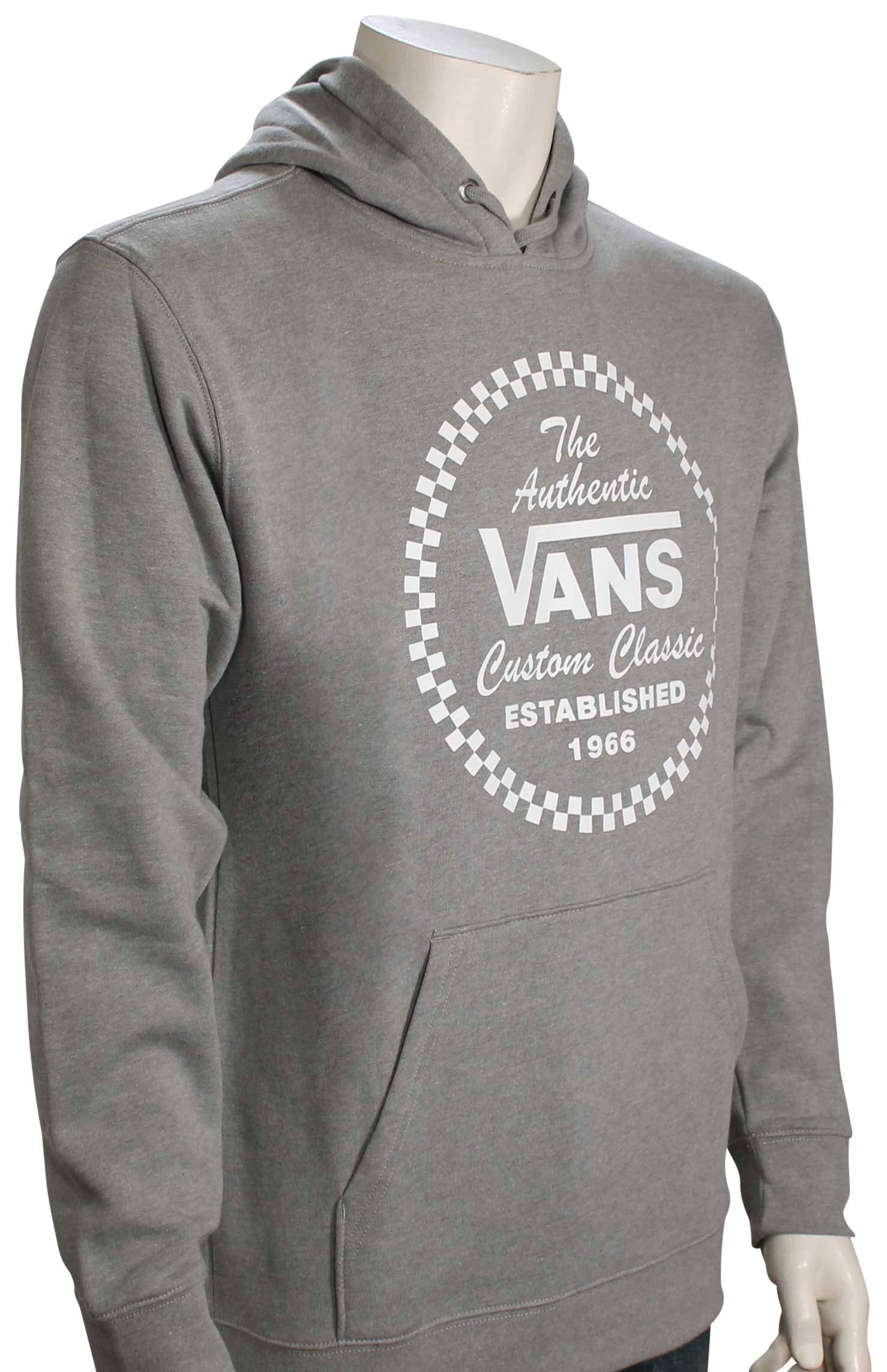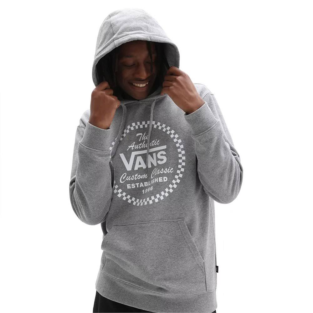 Pullover hoodie with one front pocket and checkerboard logo graphics printed on the chest. 60% cotton, 40% polyester. The gray vans athletic hoodie features graphics of the classic checkerboard motif with the logo screen printed on the chest. This sweatshirt offers a sporty look, a comfortable fit and great comfort. It has a kangaroo pocket to protect your hands or personal items and an adjustable hood. Hoodie. Kangaroo front pocket. Checkerboard print with vans logo to chest. Ribbed cuffs and waist. Composition: 60% cotton, 40% polyester.