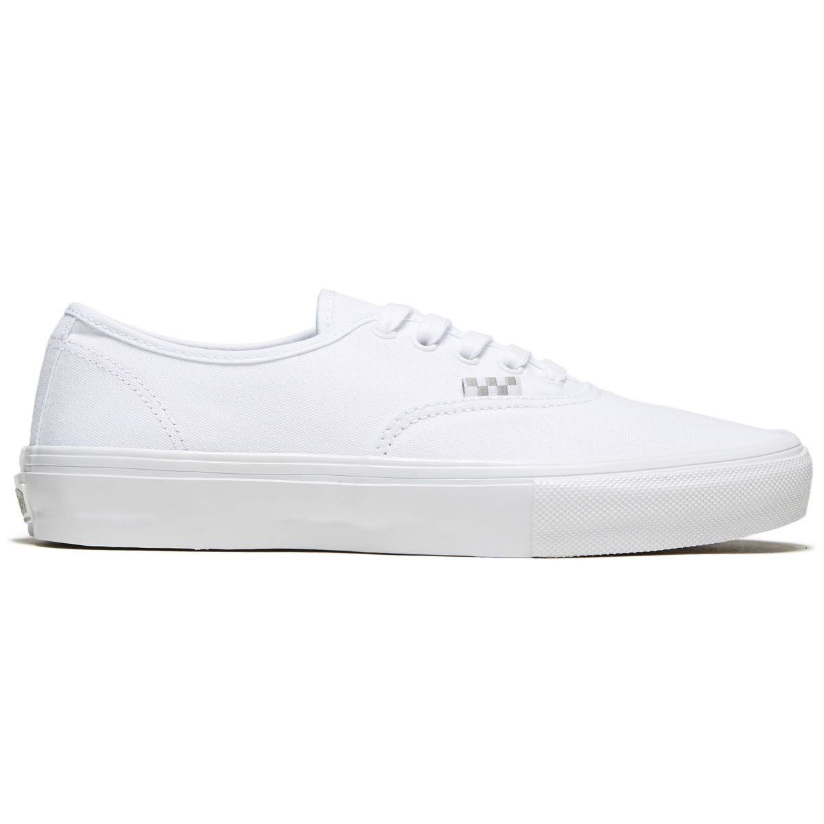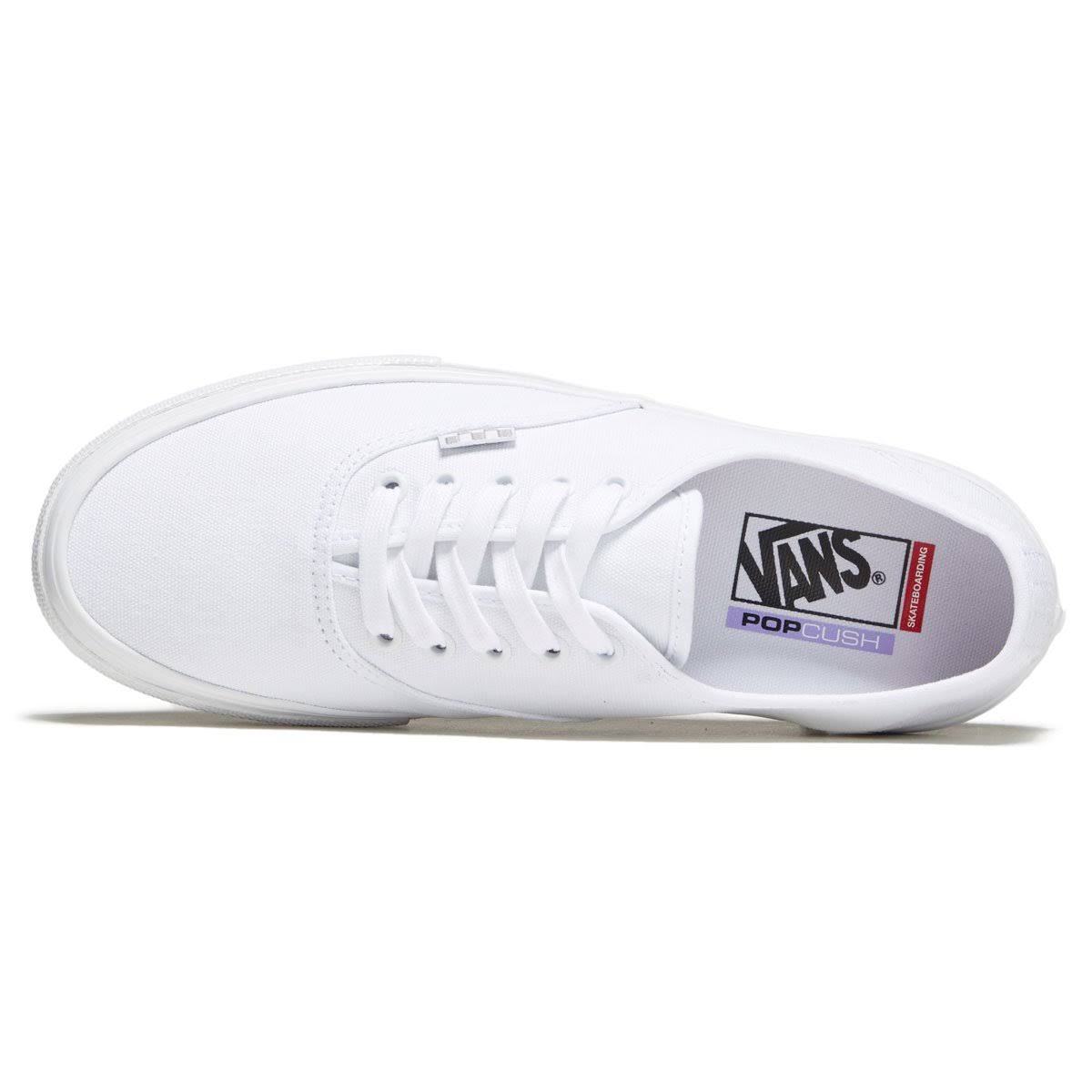 Vans Skate Authentic (True White) INCREASED DURABILITY - DURACAP reinforced materials, deeper knurl texture on the toe bumpers, and higher sidewall heights provide a more heritage look with increased durability and protection. FULLY REDESIGNED UPPERS - Reconstructed with a molded heel counter and internal tongue straps for a locked-in fit and more board control. LEGENDARY GRIP - Our new, proprietary SickStick gum rubber compound is our stickiest rubber yet. POPCUSH CUSHIONING - Our best cushioning and impact protection. POPCUSH energy return footbeds help protect your feet while helping to lessen leg fatigue for longer skate sessions.