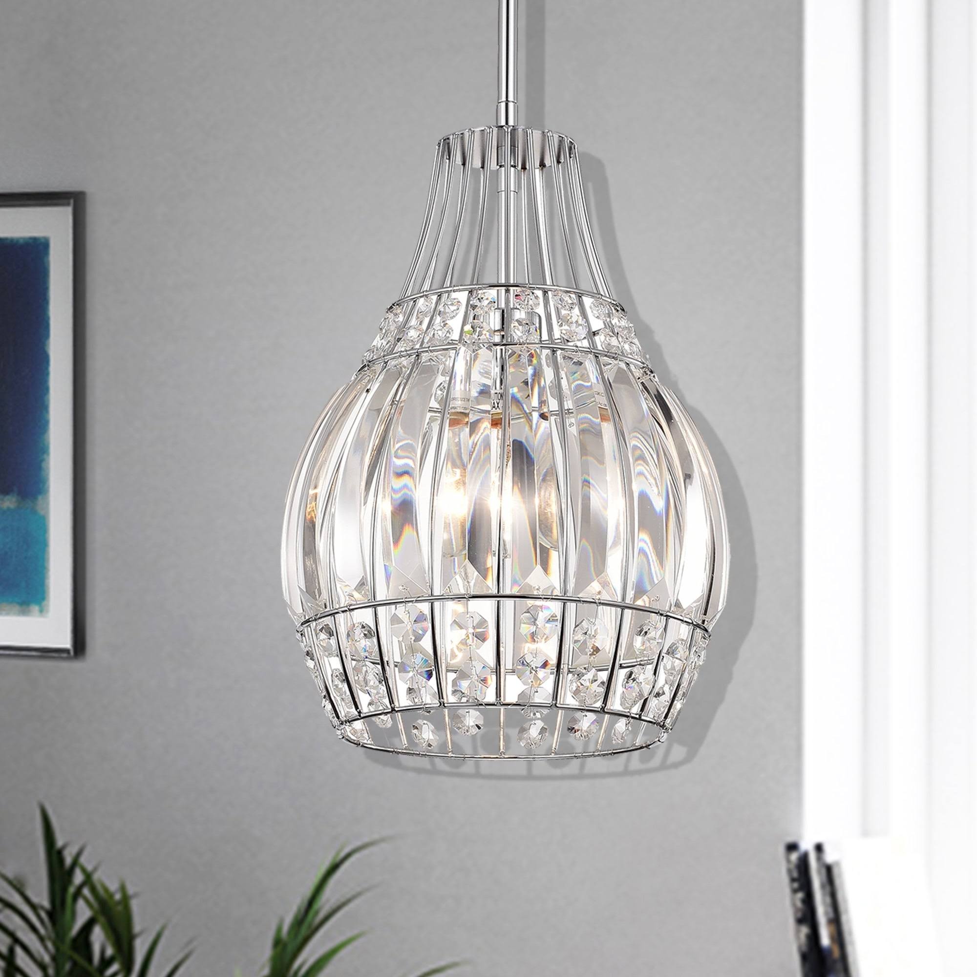 This is the Claudia Chrome Pendant. This dynamic lighting element features generous rows of crystals to catch the light. Combine several to give your space much needed character and illumination. It has a chrome finish and a crystal clear glass shade.