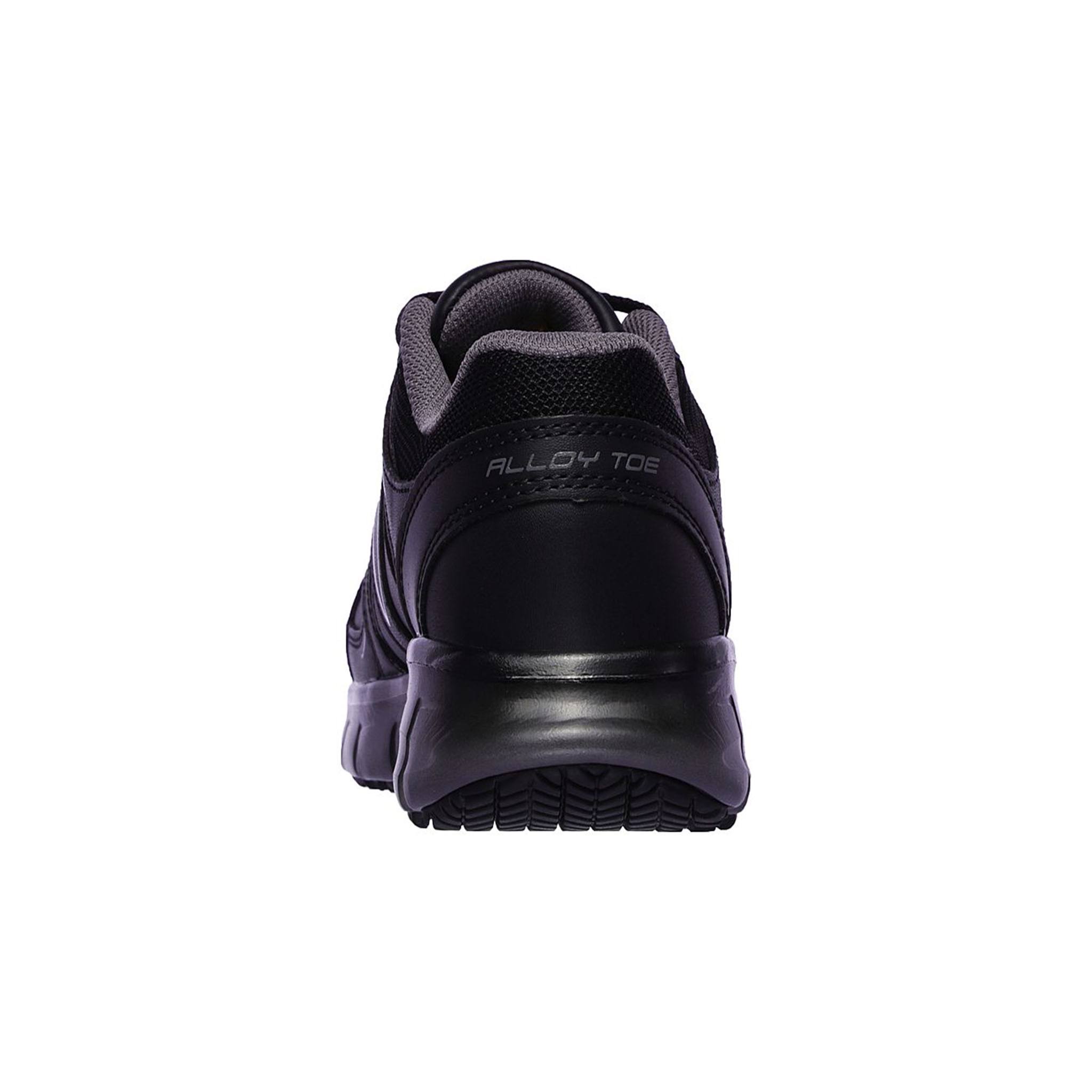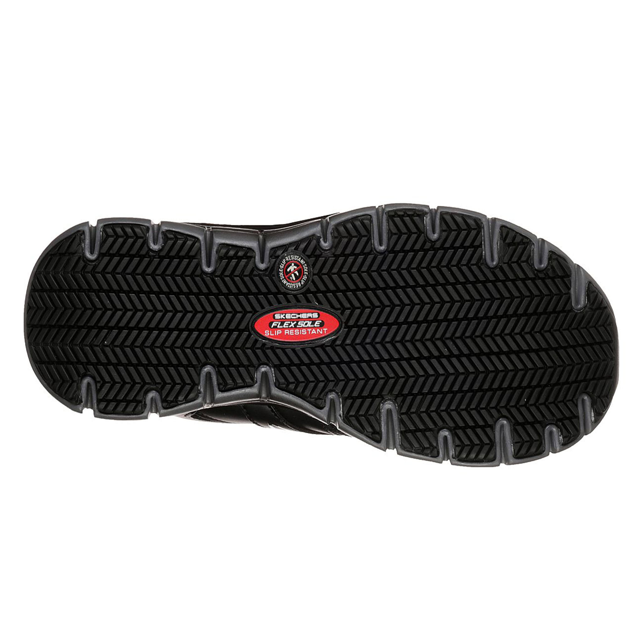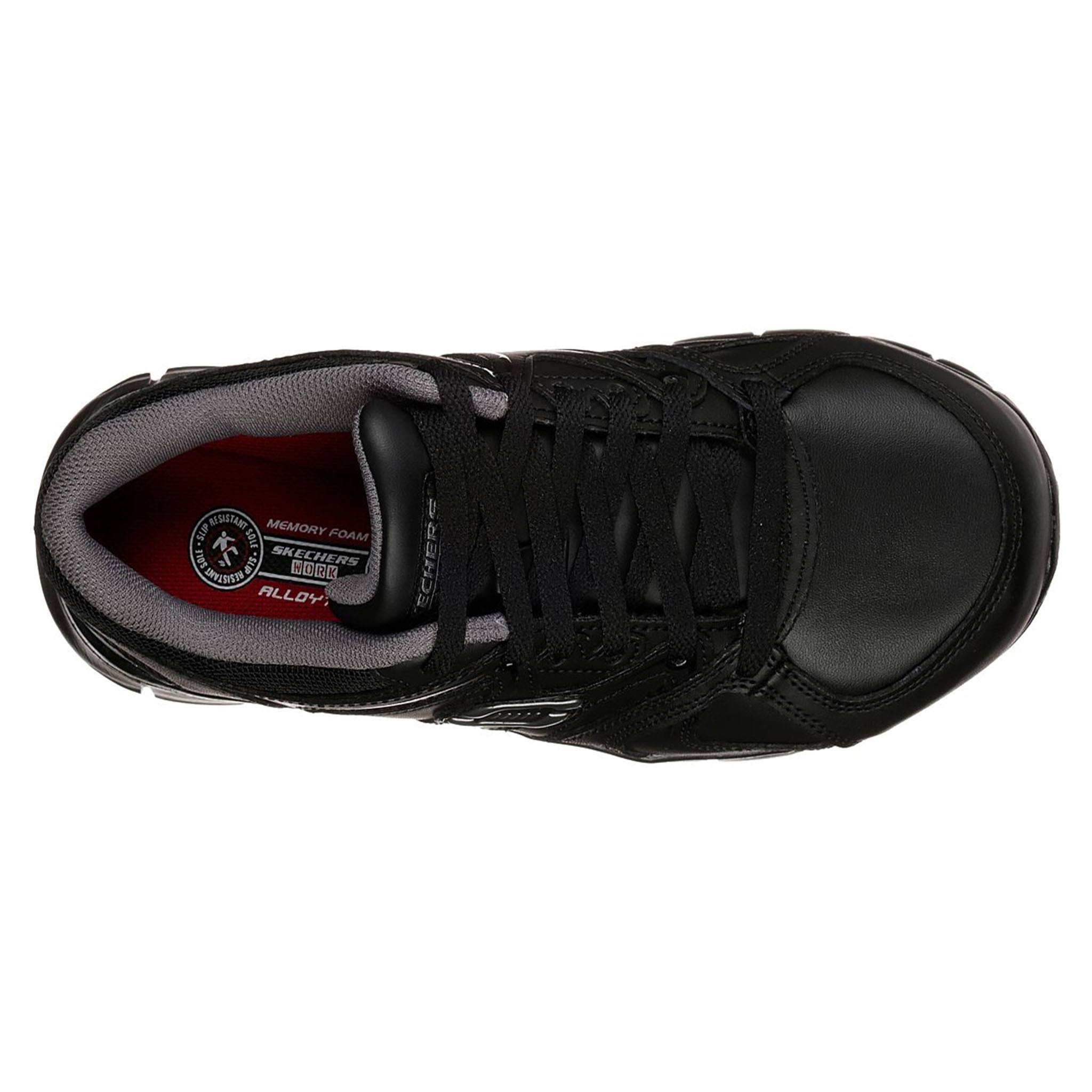Sporty style meets safety in the SKECHERS Work: Synergy - Sandlot ST shoe. Smooth nubuck leather and synthetic upper in a lace up sporty alloy toe slip resistant work sneaker with stitching accents and Memory Foam insole. Smooth nubuck leather upper. Synthetic overlays. Lace up sporty casual alloy safety toe slip resistant work sneak. Stitching accents. Printed reflective side stripe detail. Contrast colored side S logo. Layered side overlay trim. Stabilizing heel overlay. Lace up front. Contrast colored collar trim. Padded collar and tongue. Soft fabric shoe lining. Memory Foam topped cushioned removable comfort insole. FlexSole shock absorbing lightweight flexible midsole. Slip resistant flexible rubber traction outsole. 1.25" heel.