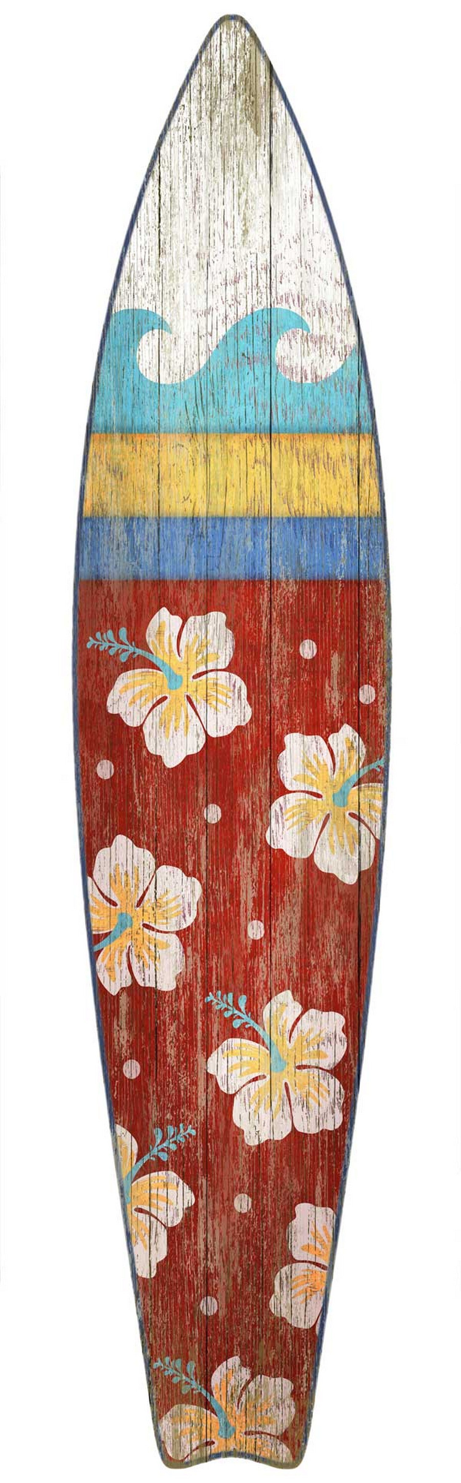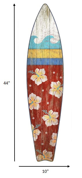 Vintage and distressed, the Hawaiian Flowers Surfboard Wall Decor replicates a fun surfboard for your space. Printed directly onto distressed wood in the shape of a board that include knots and other imperfections which enhance the vintage look and feel. Surf's Up with this vintage looking tropical surfboard art that is a unique addition to any beach house or surfer loving motif. 44" x 10" x 1".